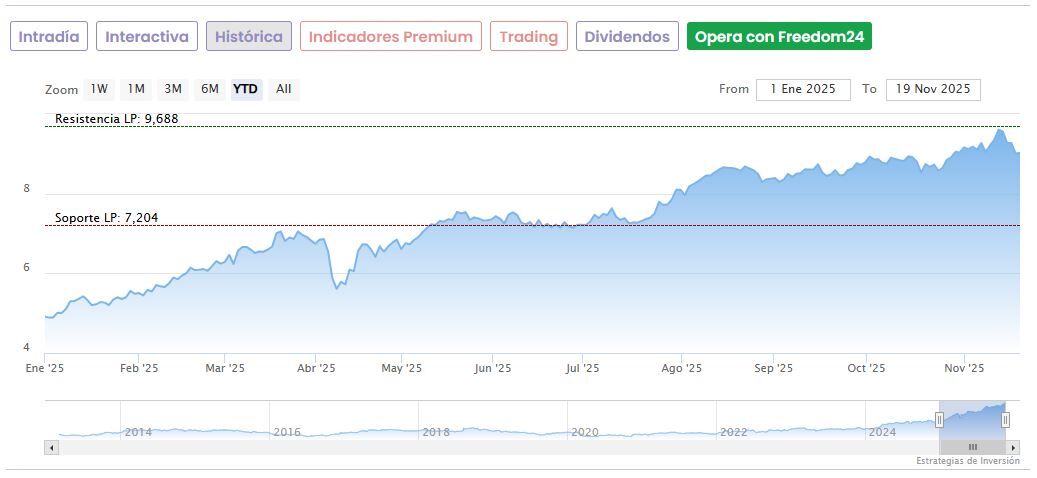 La nueva valoración supone un potencial alcista de un 26,4% adicional para unas acciones que acumulan una subida de más de un 75% en lo que va de 2025, y eso que ha corregido en los últimos días tras haber llegado a tocar unos máximos históricos de 9,688 euros el pasado 13 de noviembre.