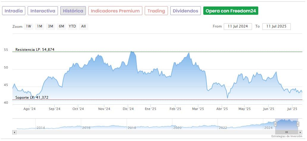 Las acciones se acercan de nuevo a los mínimos de las últimas 52 semanas que marcaron el 7 de abril en 42,10 euros, estando actualmente un 2,23% por encima de estos niveles.