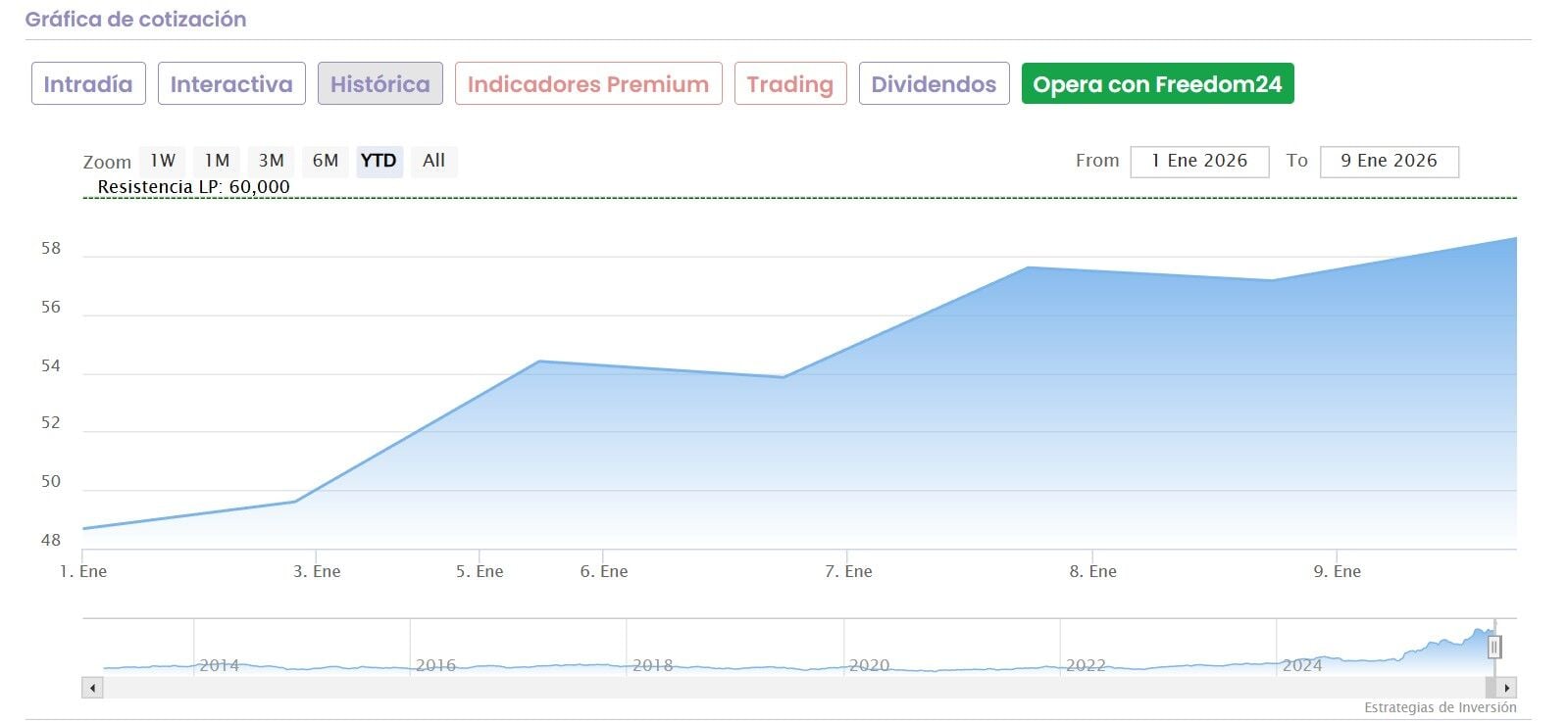 Una cota, los 60 euros por acción que ha llegado a tocar en su cotización este valor del Ibex 35 el pasado 8 de enero, con máximo histórico, del que apenas ahora le separa un 1,8%.