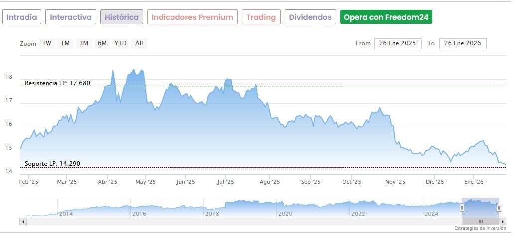 Hoy las acciones de Redeia suben un 0,42% a media mañana en el IBEX 35 hasta marcar 14,41 euros, situándose apenas un 0,84% por encima de los mínimos de las últimas 52 semanas que marcó el pasado día 23 en 14,29 euros. Los títulos acumulan una caída de más de un 26% desde su punto más alto del período, situado en los 19,51 euros desde el 4 de abril del año pasado.