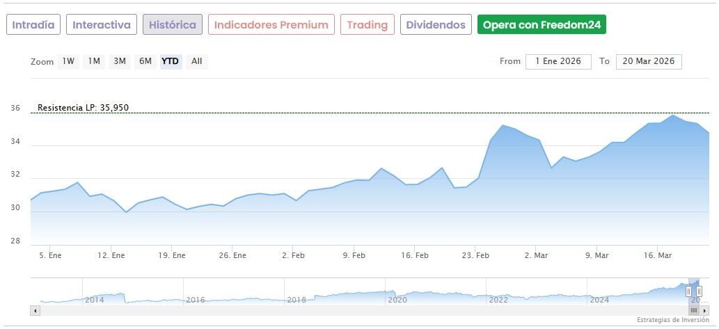 Endesa no logra escapar hoy del castigo generalizado en el IBEX 35, con una caída a primera hora de la mañana de un 2,24% hasta los 33,92 euros. No obstante, todavía acumula una subida de un 10,74% en lo que va de 2026 y mira no demasiado lejos (-5,65%) los máximos de 35,95 euros que tocó el pasado 17 de marzo.