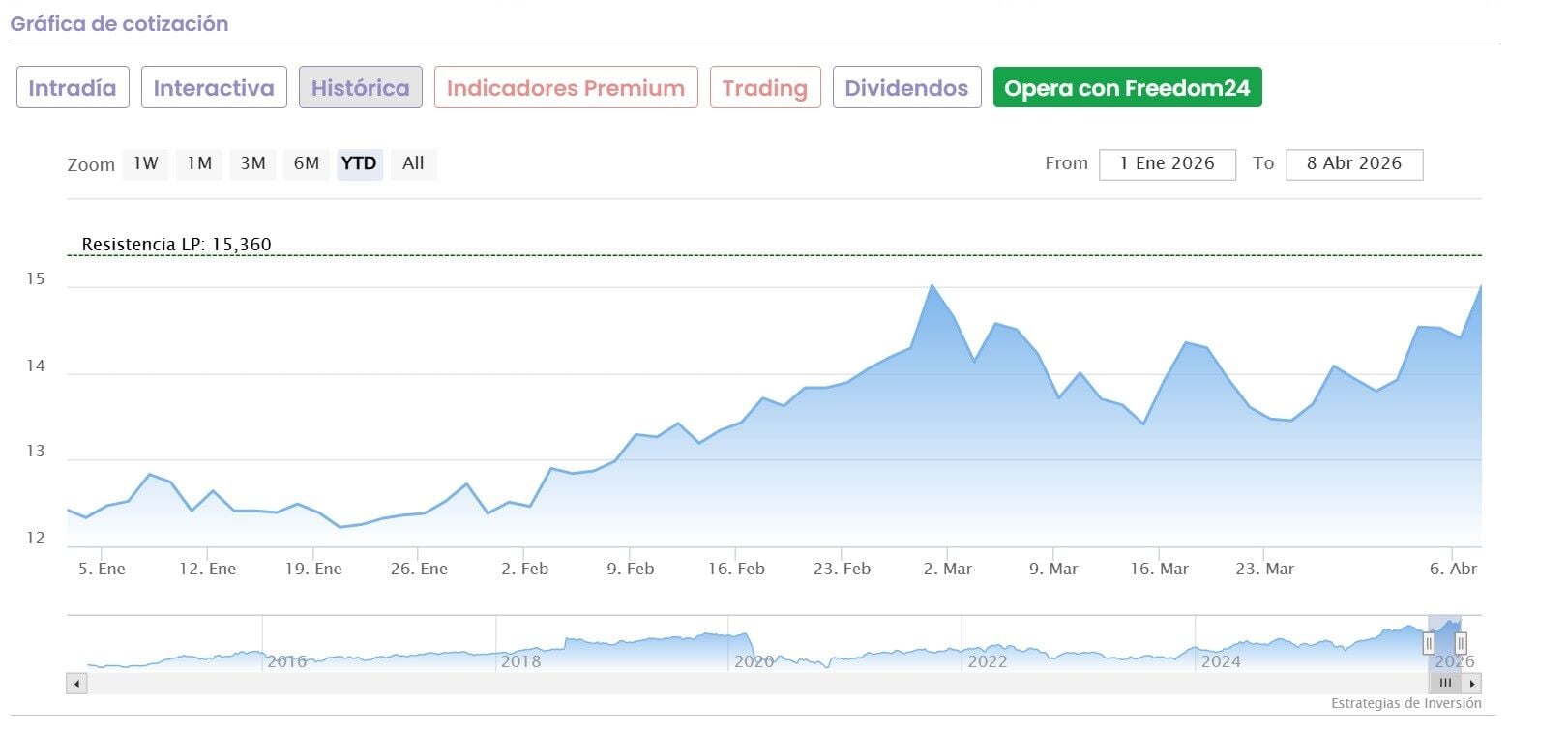 En lo que va de año las acciones de Merlin Properties ganan un 3,23% en la última semana mientras que el mes repuntan un 5,5% con una progresión alcista en el último trimestre que alcanza el 17,7%. Ya en el año, avanzan sus títulos un 20,7%, con lo que se coloca dentro del Top 10 de los valores que más suben en 2026 dentro del Ibex 35.