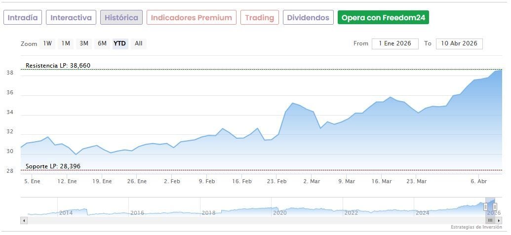 Las acciones de Endesa retrocedían un ligero 0,20% en la mañana de este lunes hasta marcar 38,45 euros en el IBEX 35, alejándose ligeramente de estos máximos. No obstante, suben un 25,5% en lo que va de año y un 83,10% desde sus mínimos de las últimas 52 semanas, fijados en los 21 euros desde el 7 de abril del año pasado.