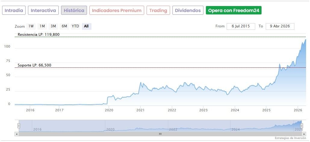 Esta nueva valoración de Berenberg supone un potencial alcista del 13,7% para una acción que se encuentra en máximos históricos tras haber subido más de un 40% solo en lo que va de 2026. Hoy los títulos de Grenergy suben a media mañana un 3,94% hasta marcar 121,20 euros, superando de nuevo el reciente récord de 119,80 euros que llevaba vigente desde el pasado martes (7 de abril).
