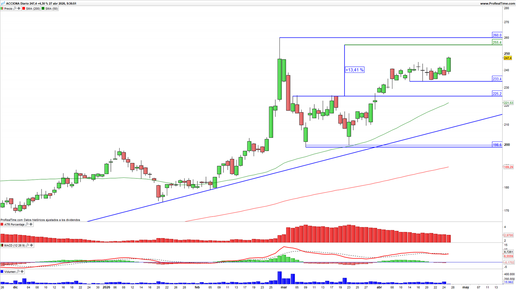 Acciona (ANA) en escala diaria con volatilidad (gráfico central superior), MACD (gráfico central inferior) y actividad de contratación (ventana inferior). Fuente: ProRealTime y elaboración propia.