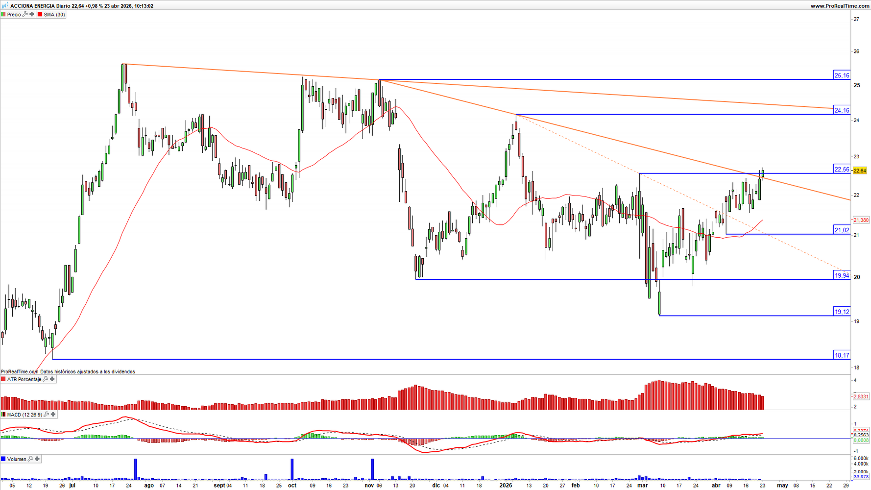 La cotización de Acciona Energías Renovables esta produciendo una mejoría técnica durante las últimas semanas destacando las subidas producidas en la sesión de hoy, donde nos encontramos asistiendo a la superación de un importante nivel de resistencia en el entorno de los 22,56€ por acción. En este sentido, Acciona Energías Renovables se sitúa como uno de los activos más interesantes del Ibex35 de cara a las próximas sesiones.