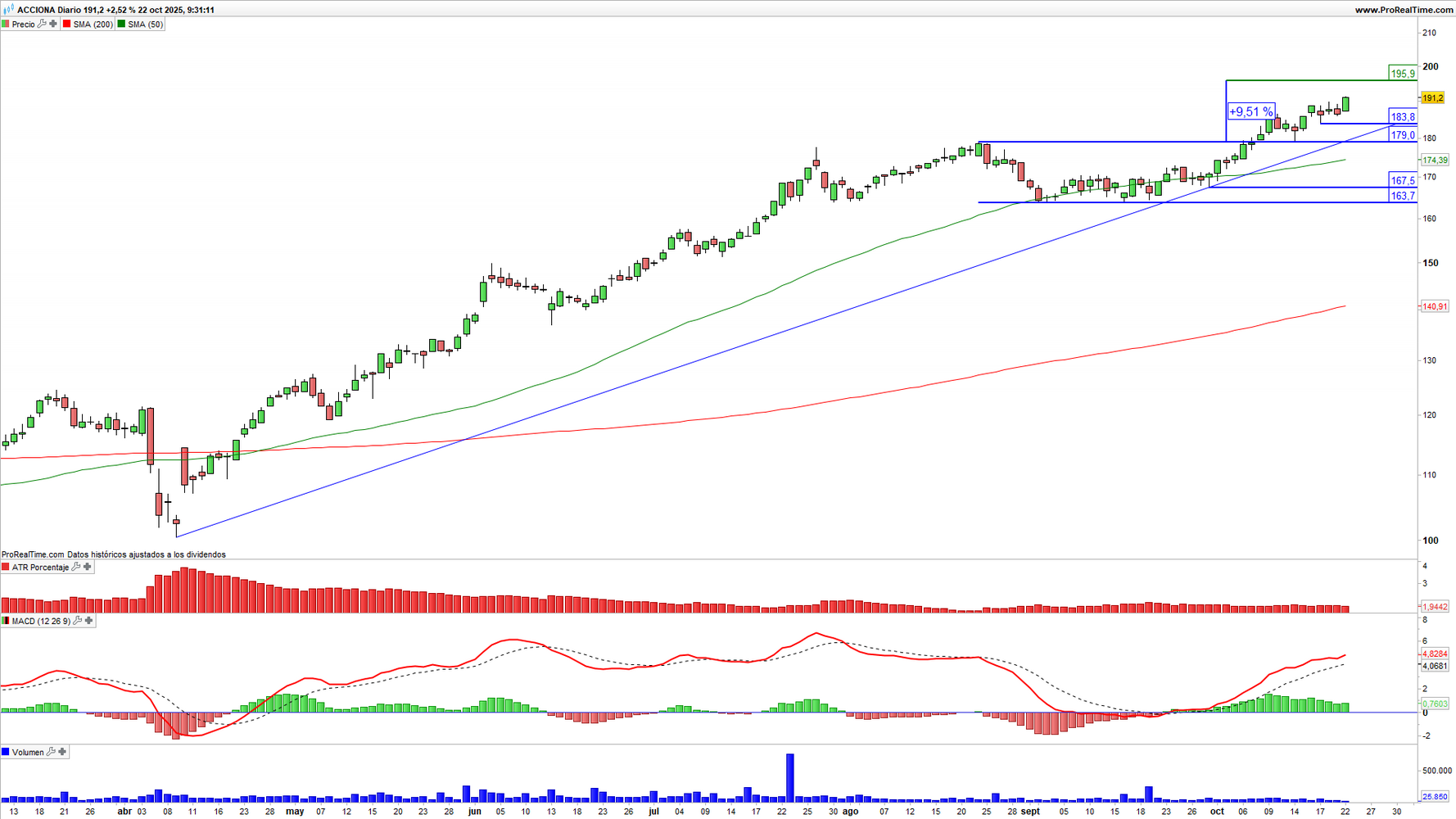 Acciona (ANA) en escala diaria con volatilidad (gráfico central superior), MACD (gráfico central inferior) y actividad de contratación (ventana inferior). Fuente: ProRealTime y elaboración propia.