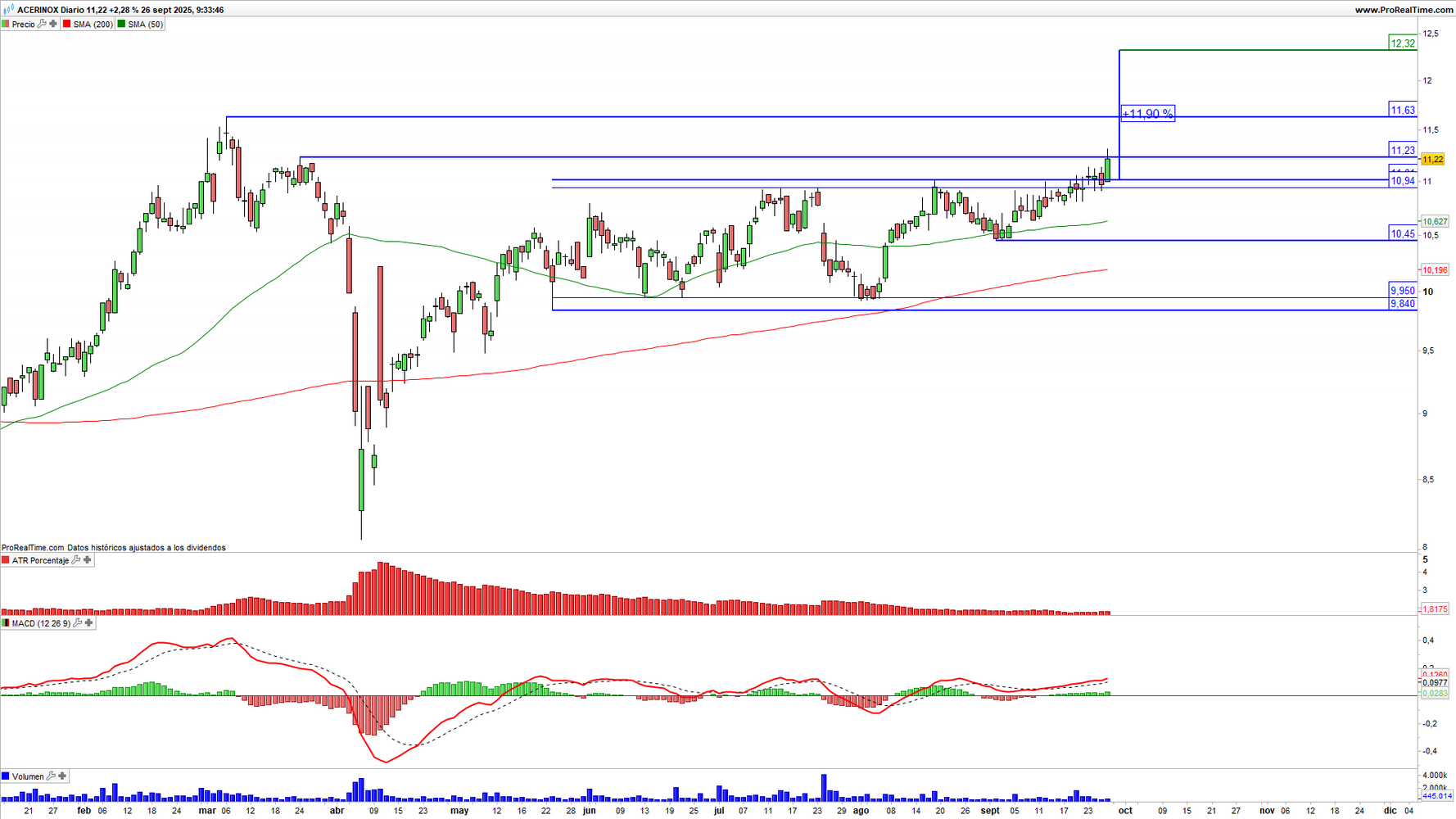 La cotización de Acerinox inicia la jornada bursátil con importantes subidas superiores al 2%. De este modo, el activo comienza a desarrollar una continuidad alcista tras producir recientemente la superación de un rango lateral comprendido entre los 9,84 y los 11,01€ por acción, por lo que seguiremos manteniendo una visión positiva de cara a las próximas sesiones.