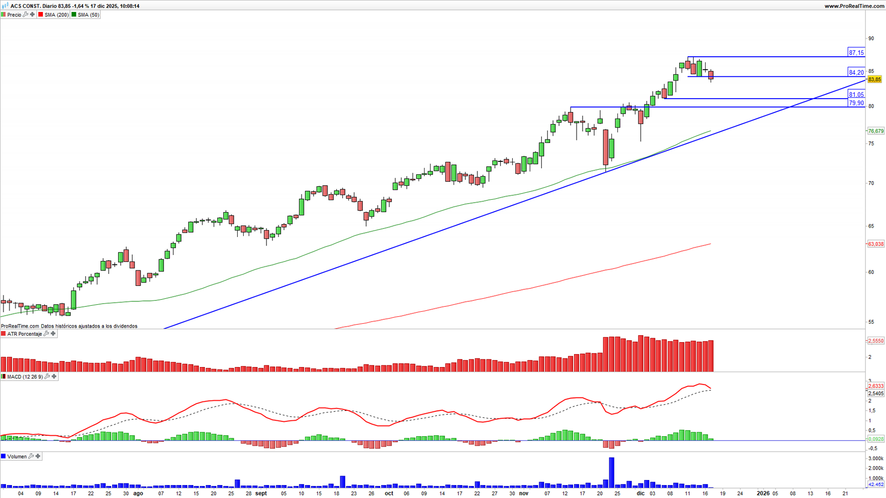 ACS (ACS) en escala diaria con volatilidad (gráfico central superior), MACD (gráfico central inferior) y actividad de contratación (ventana inferior). Fuente: ProRealTime y elaboración propia.