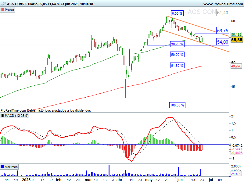 ACS (ACS) en escala diaria con volatilidad (gráfico central superior), MACD (gráfico central inferior) y actividad de contratación (ventana inferior). Fuente: ProRealTime y elaboración propia.