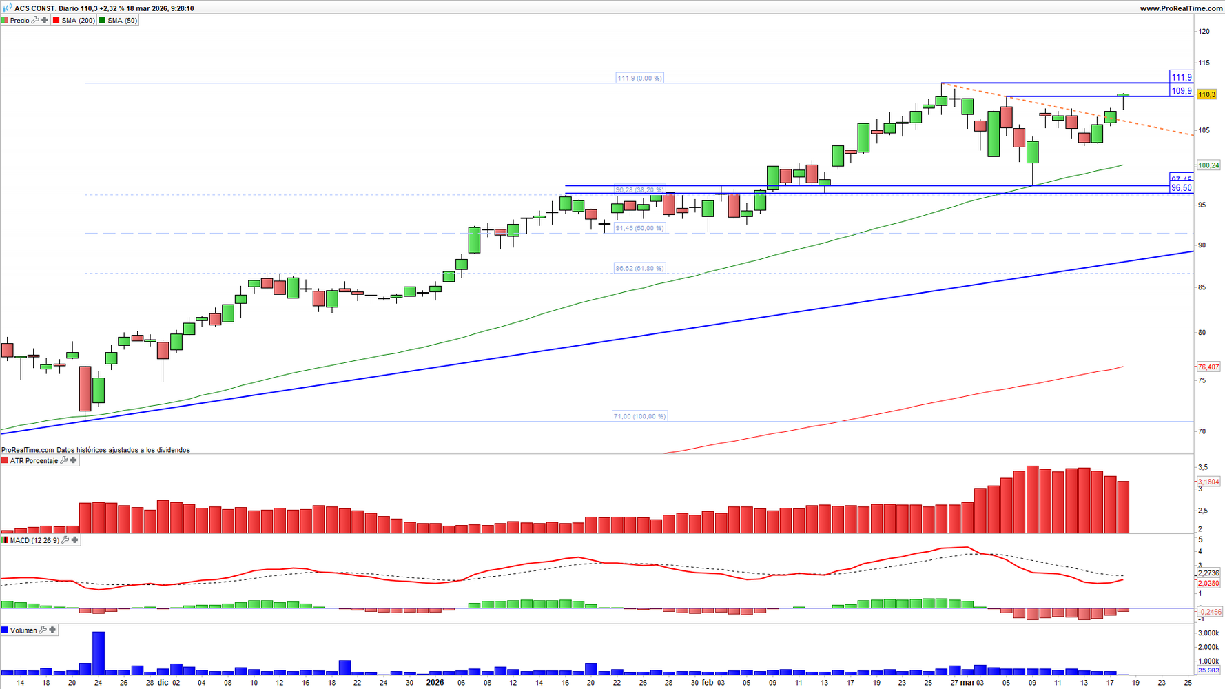 ACS (ACS) en escala diaria con volatilidad (gráfico central superior), MACD (gráfico central inferior) y actividad de contratación (ventana inferior). Fuente: ProRealTime y elaboración propia.
