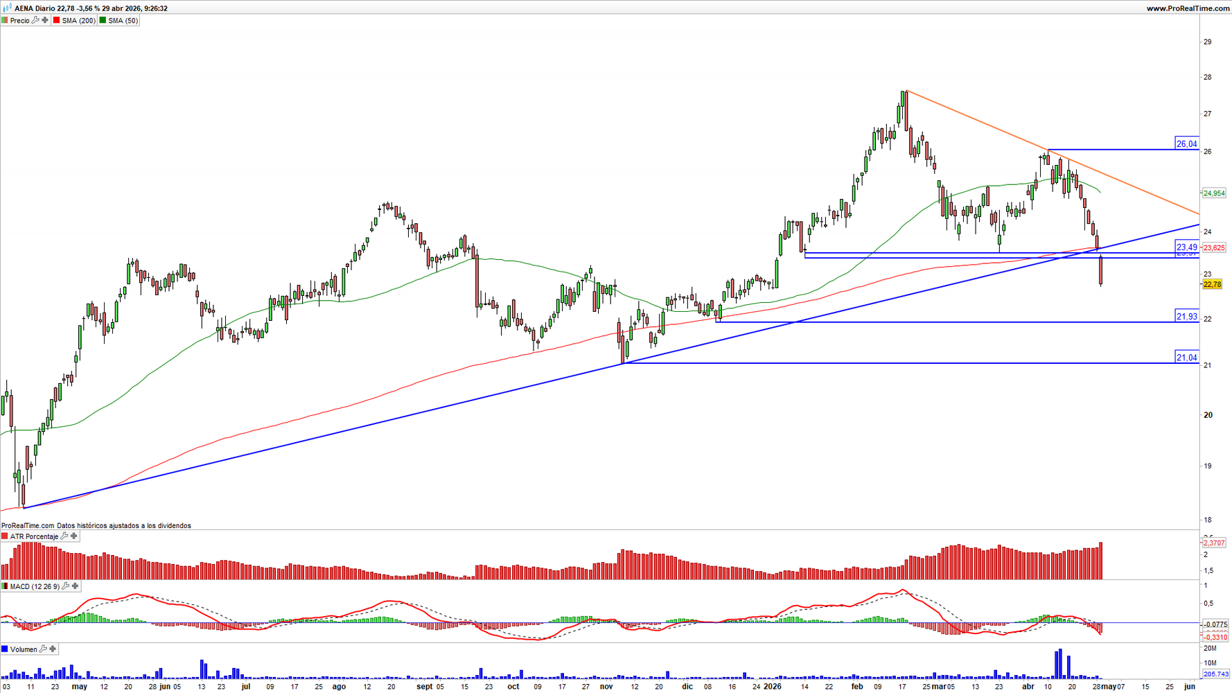 En el gráfico diario de Aena (AENA), detectamos que tras la presentación de resultados trimestrales el activo arranca la jornada con caídas del 3,50% aproximadamente. De este modo, los niveles de volatilidad aumentan con fuerza y el precio perfora un área de soporte en las inmediaciones de los 23,37 y los 23,49€ por acción. Además, la directriz alcista que acompañaba al precio desde los mínimos del pasado mes de abril del año 2025 también se está perforando con fuerza en la jornada de hoy. Por tanto, consideramos como escenario más probable que en las próximas sesiones las acciones de Aena puedan seguir produciendo caídas y atacar el siguiente área de soporte relevante que proyectamos a partir de los 21,93€ por acción.