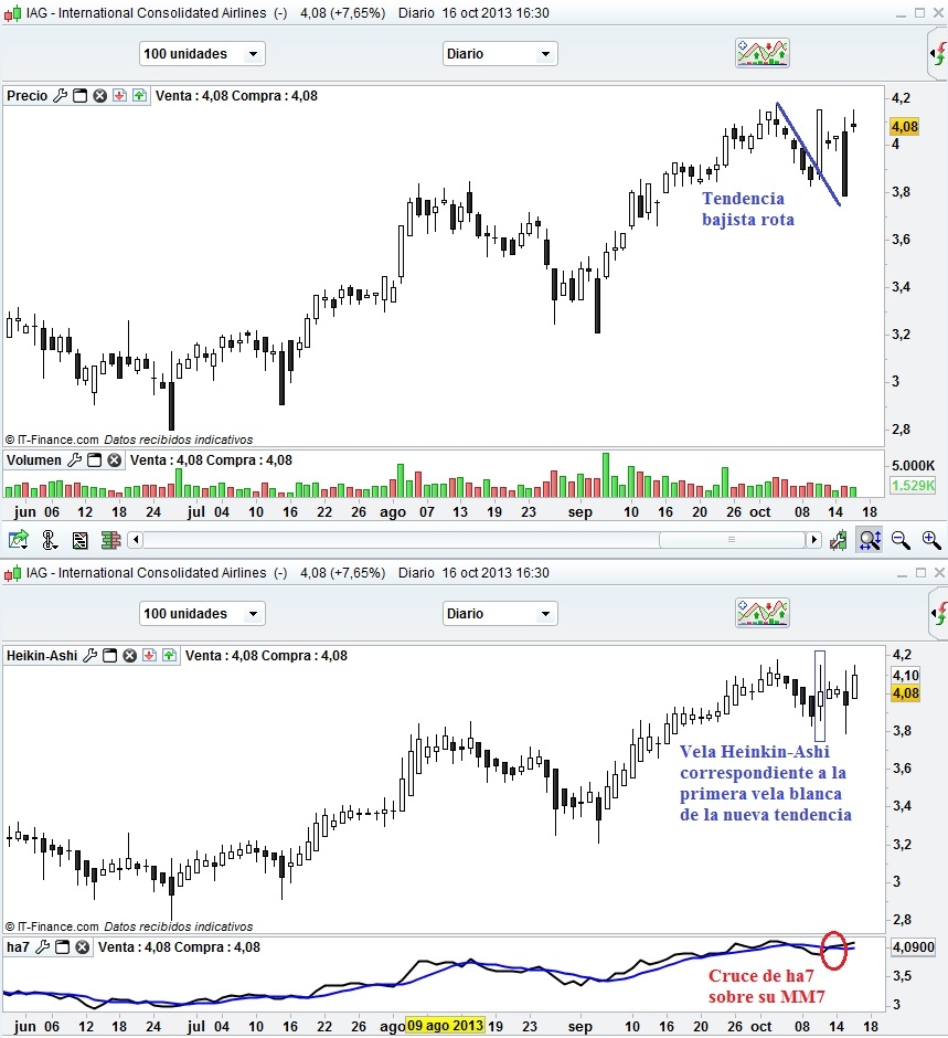 En el gráfico de Velas Heikin-Ashi apreciamos mejor todavía la anterior tendencia bajista, que al terminar comienza una tendencia alcista, en lugar de la tendencia lateral que se ve en el gráfico de Velas Japonesas.