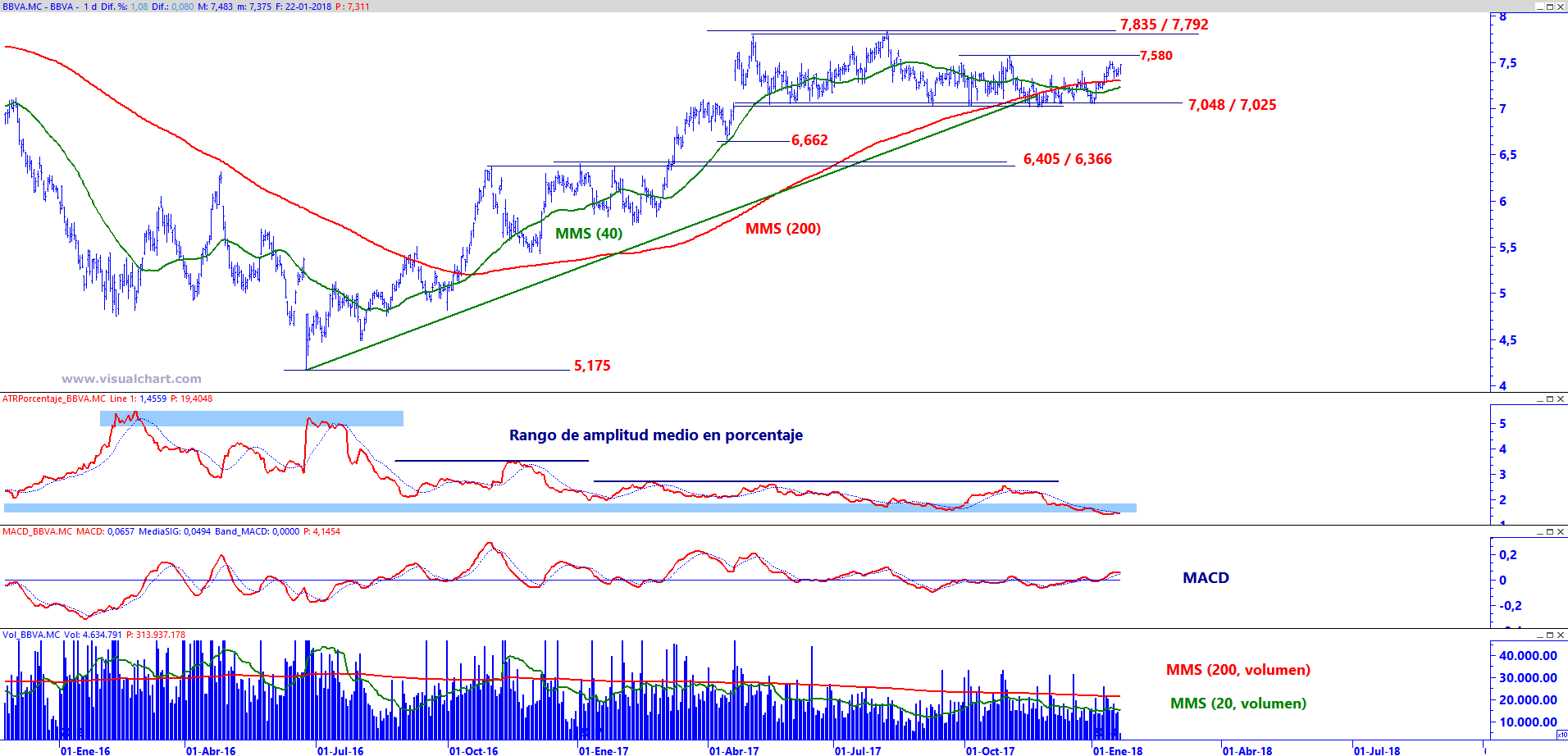 BBVA se encuentra en pleno proceso alcista en el corto plazo, precisamente, desde el área de soporte relevante de medio plazo de los 7,048 / 7,025, movimiento que a su vez permite a las compras consolidar el precio de cotización por encima de sus medis móviles de largo plazo. El movimiento presenta fiabilidad en un entorno alcista de fondo y de reducida volatilidad, lo que permite seguir manteniendo un sesgo constructivo en el activo bajo estudio, como usted muy bien plantea. En este sentido, la cotización se acerca a niveles de referencia como son los 7,58 y, más concretamente, el área de resistencia significativa comprendida en torno a los 7,835 / 7,792, siendo la superación de ambas resistencias una oportunidad de reincorporación en largo, la primera para un perfil con menor aversión al riesgo mientras que la segunda, permitiría buscar una incorproación a un inversor tendencial de medio plazo con mayor aversión al riesgo, por lo que usted decide en qué punto incorporarse. Por otro lado, una vuelta a la zona de los 7,048 / 7,025 que podríamos comparar con los 7€ que usted estaba buscando es sin duda una nueva oportunidad de largos.