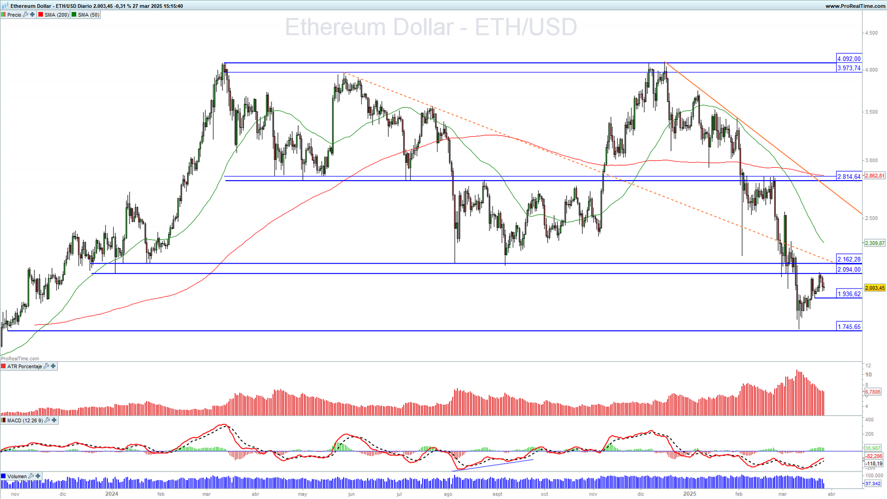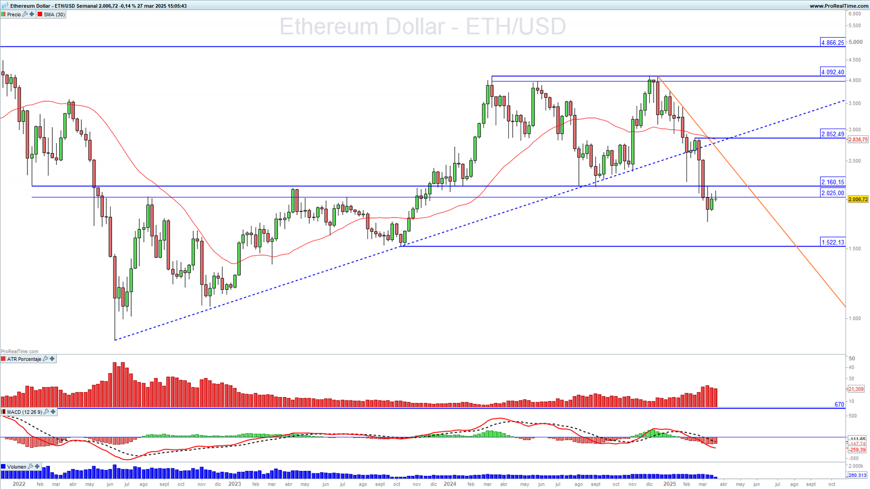 Gráfico 4. Ethereum (ETH) en escala semanal con volatilidad (gráfico central superior), MACD (gráfico central inferior) y actividad de contratación (ventana inferior). Fuente: ProRealTime y elaboración propia.