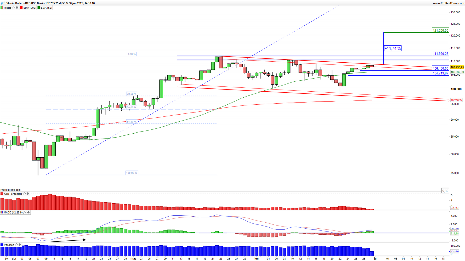Bitcoin (BTC) En estos momentos nos encontramos en una zona de relevancia clave para el precio de Bitcoin, puesto que, el precio se encuentra atacando la parte alta de un canal bajista, cuya formación ha servido para limpiar o purgar los niveles de extrema sobrecompra y, aproximar al precio a los niveles de Fibonacci de las subidas producidas desde los mínimos del pasado mes de abril. En este sentido, es necesario que asistamos a un precio de cierre diario por encima de las directrices bajistas para activar un objetivo alcista en Bitcoin, con un posible proyección de ascenso teórica de un 11,74%. De este modo, vigilamos dos soportes de corto plazo en los mínimos establecidos durante las últimas sesiones, en el área de los 106.450$ y los 104.714$, por lo que mantendremos una actitud constructiva mientras no asistamos sobre todo a un cierre diario por debajo de los 104.714$, puesto que, si el segundo soporte es perforado, el precio podría corregir y buscar de nuevo apoyos en la parte baja del canal bajista.
