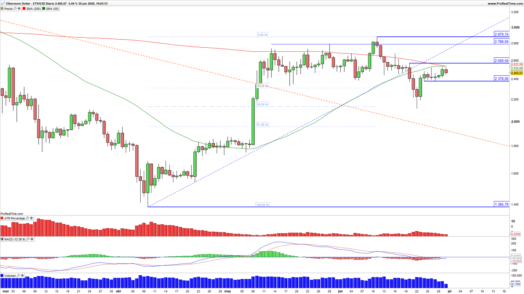 Gráfico 4. Ethereum (ETH) en escala diaria con volatilidad (gráfico central superior), MACD (gráfico central inferior) y actividad de contratación (ventana inferior). Fuente: ProRealTime y elaboración propia.
