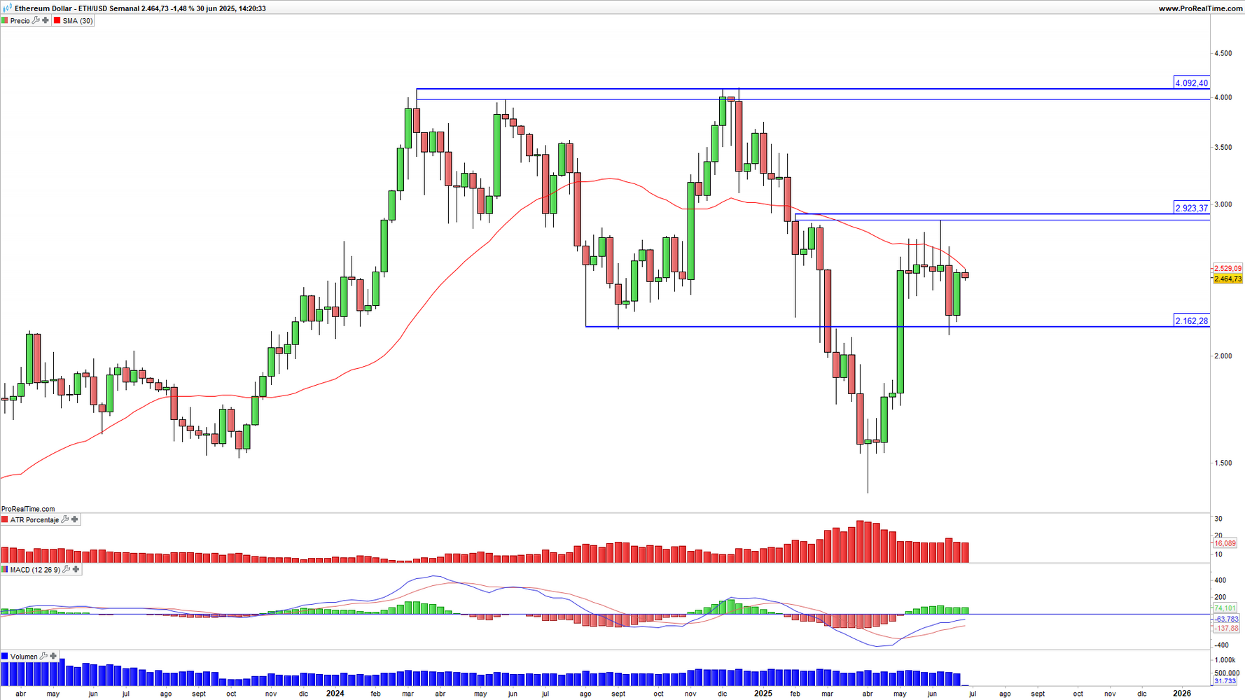 Gráfico 5. Ethereum (ETH) en escala semanal con volatilidad (gráfico central superior), MACD (gráfico central inferior) y actividad de contratación (ventana inferior). Fuente: ProRealTime y elaboración propia.