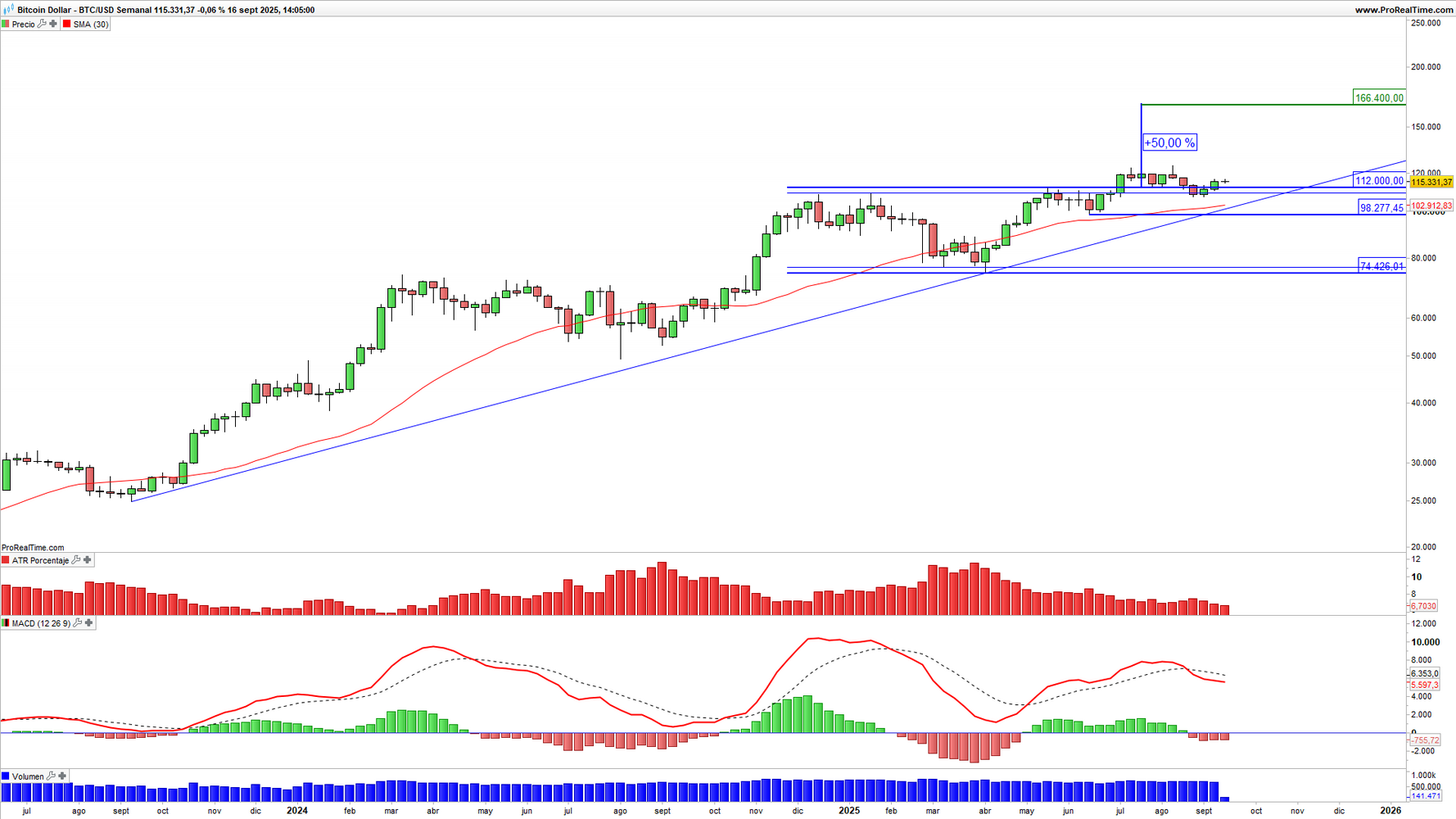 Gráfico 3. Bitcoin (BTC) en escala semanal con volatilidad (gráfico central superior), MACD (gráfico central inferior) y actividad de contratación (ventana inferior). Fuente: ProRealTime y elaboración propia.