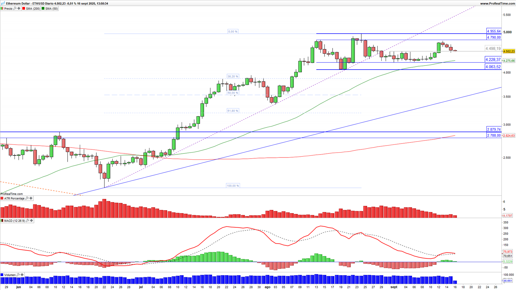 Ethereum (ETH) Tras los fuertes avances producidos durante las últimas semanas, el oscilador MACD ha conseguido neutralizar los niveles de extrema sobrecompra mediante la formación de un rango lateral comprendido entre los 4.063 y los 4.955$. En este sentido, vigilamos un área relevante intermedia sobre los 4.498$, zona que ha actuado como una resistencia importante durante las últimas semanas y, en estos momentos podría actuar como zona de soporte, por lo que si asistimos a cierres diarios por debajo de los 4.498$, el precio podría volver a atacar la parte baja del rango lateral durante las próximas sesiones. No obstante, si el precio consigue sostenerse arriba de los 4.498$, se podrían producir ataques a la parte alta del rango lateral, de modo que, es importante que el precio no registre un cierre diario por debajo de los 4.498$ durante las próximas sesiones.