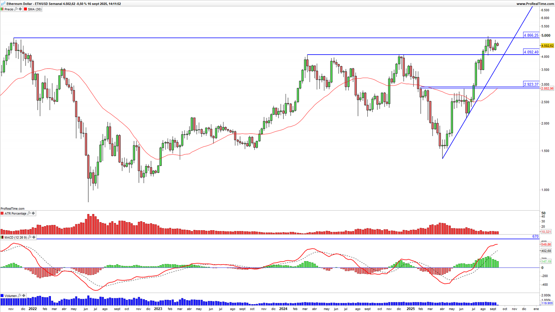 Gráfico 5. Ethereum (ETH) en escala semanal con volatilidad (gráfico central superior), MACD (gráfico central inferior) y actividad de contratación (ventana inferior). Fuente: ProRealTime y elaboración propia.