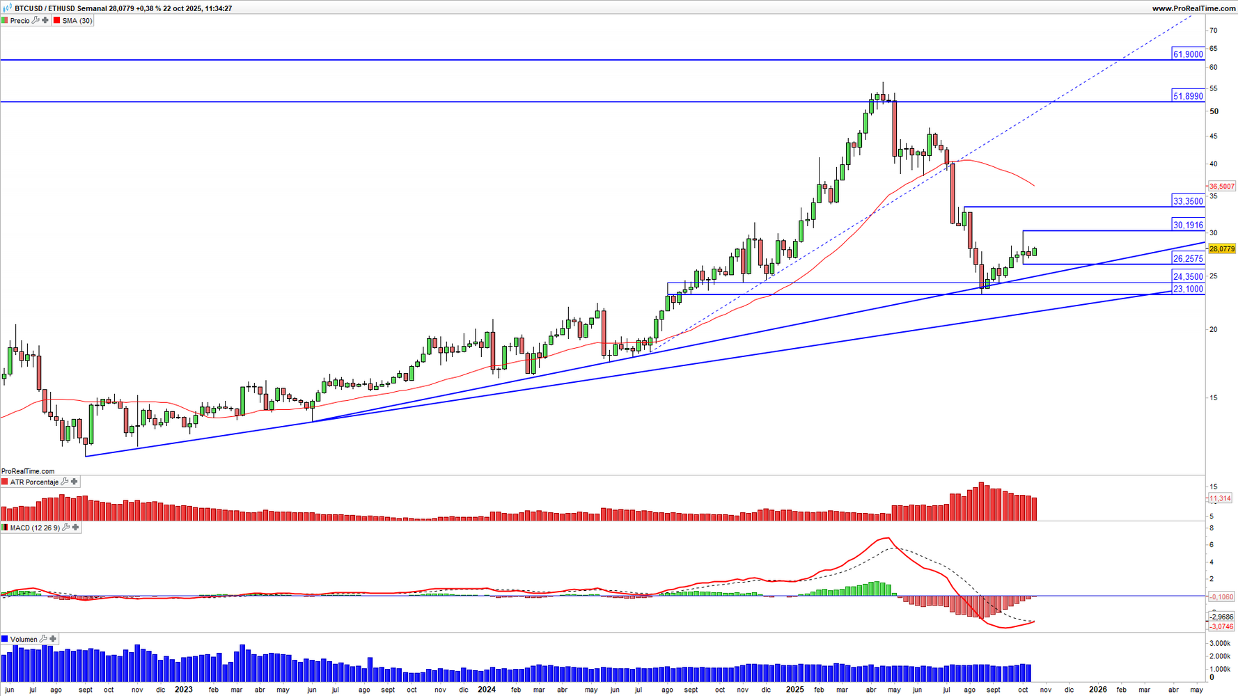 Gráfico 1. Diferencial entre Bitcoin (BTC) y Ethereum (ETH) en gráfico semanal con volatilidad (gráfico central superior), MACD (gráfico central inferior) y actividad de contratación (ventana inferior). Fuente: ProRealTime y elaboración propia.