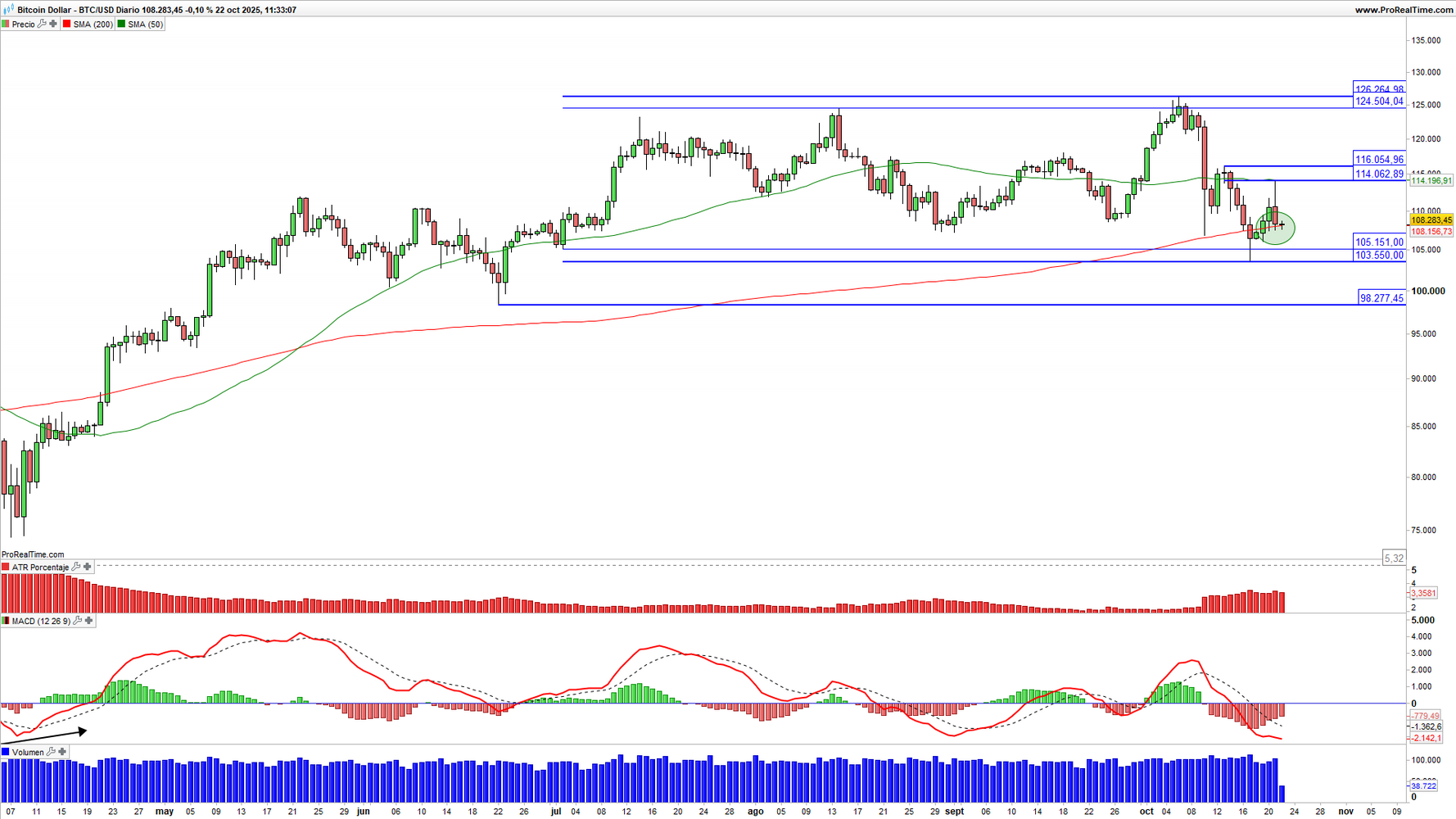 Gráfico 2. Bitcoin (BTC) en escala diaria con volatilidad (gráfico central superior), MACD (gráfico central inferior) y actividad de contratación (ventana inferior). Fuente: ProRealTime y elaboración propia