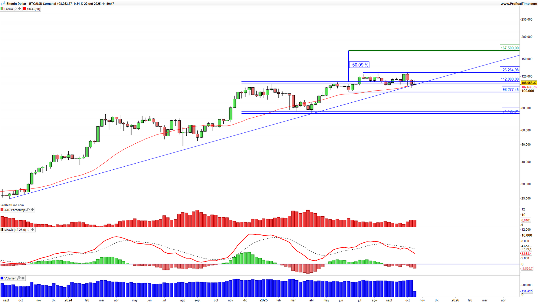 Gráfico 3. Bitcoin (BTC) en escala semanal con volatilidad (gráfico central superior), MACD (gráfico central inferior) y actividad de contratación (ventana inferior). Fuente: ProRealTime y elaboración propia.