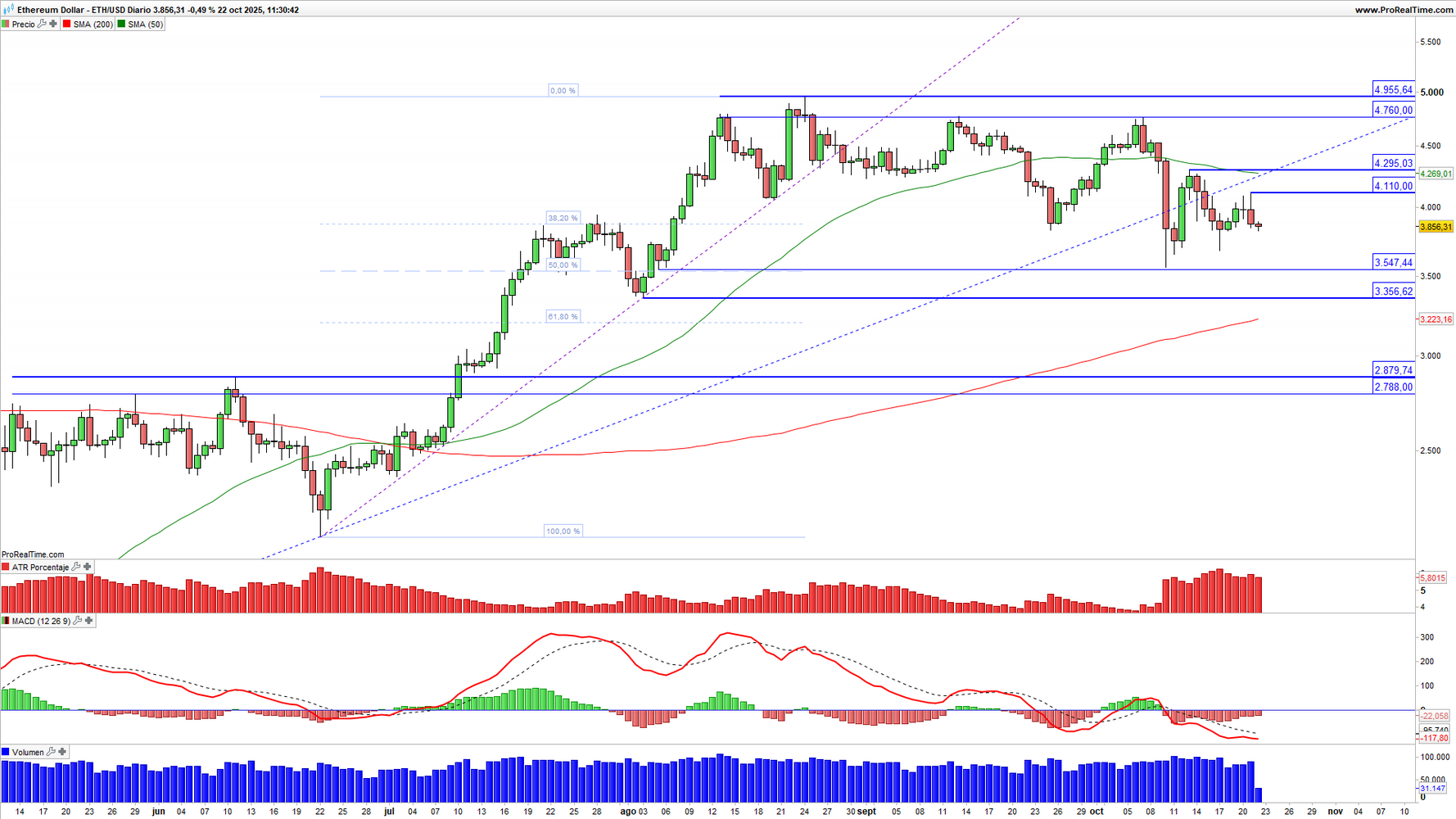 Gráfico 4. Ethereum (ETH) en escala diaria con volatilidad (gráfico central superior), MACD (gráfico central inferior) y actividad de contratación (ventana inferior). Fuente: ProRealTime y elaboración propia.