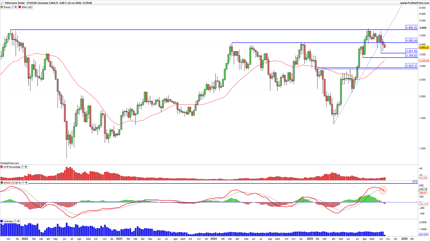 Gráfico 5. Ethereum (ETH) en escala semanal con volatilidad (gráfico central superior), MACD (gráfico central inferior) y actividad de contratación (ventana inferior). Fuente: ProRealTime y elaboración propia.