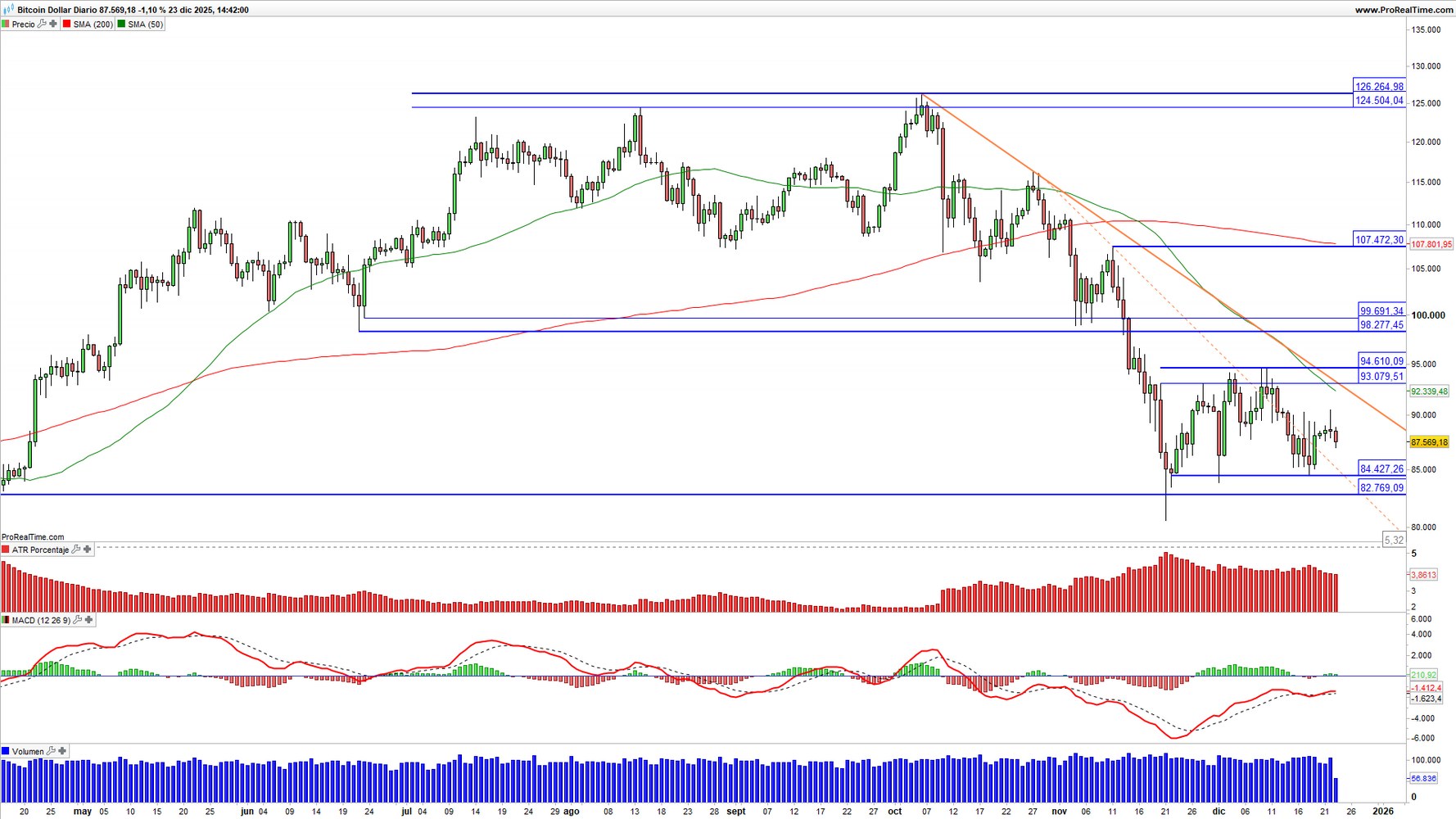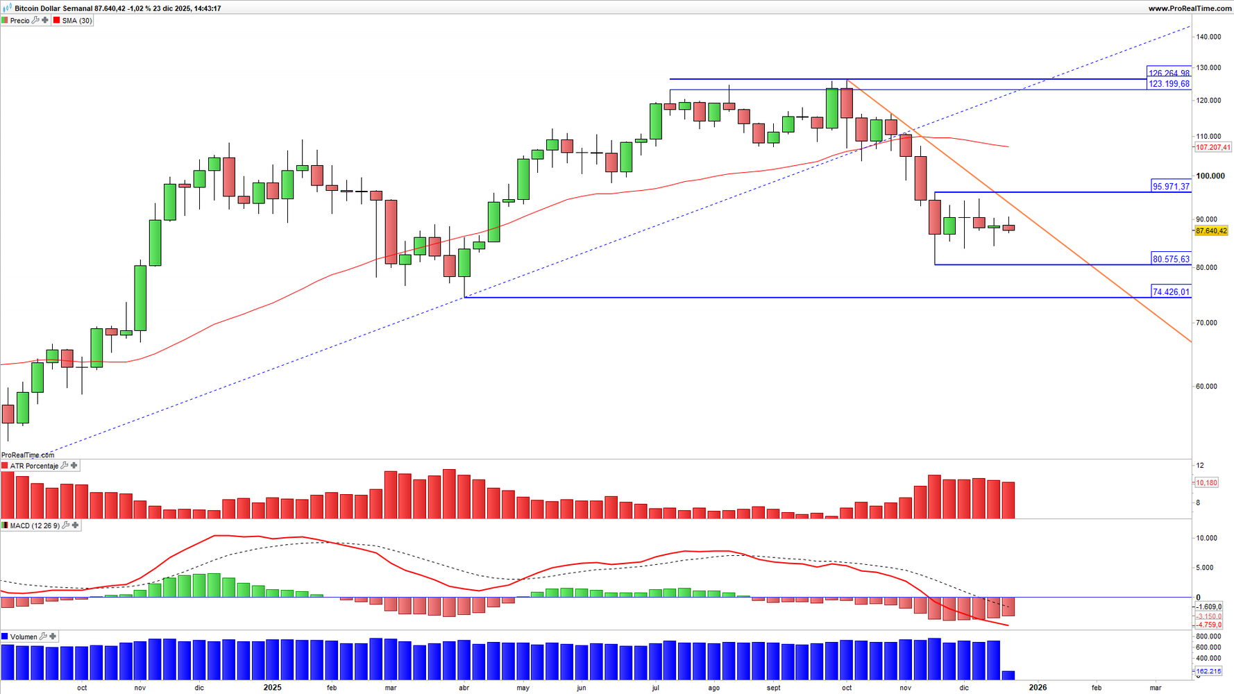 Bitcoin (BTC) Durante las últimas sesiones el precio está desarrollando con claridad la formación de un posible rango de acumulación entre las inmediaciones de los 82.769 y los 94.610$ coincidiendo el área de los 82,769$ con un importante nivel de soporte de largo plazo. En este sentido, con la formación de este proceso lateral el precio está neutralizando las lecturas de sobreventa registradas en el oscilador MACD, por lo que para obtener la confirmación de que el actual rango lateral es un proceso de acumulación será necesario que en las próximas sesiones / semanas se registre un precio de cierre diario por encima de los 94,610$. Si este escenario se produce podremos comenzar a contar con una mejoría de mayor importancia en el precio de Bitcoin, así como comenzar a confirmar niveles de soportes importantes en el entorno de los 82,769 y los 84.427$. Por el camino hasta las resistencias en la parte alta del rango lateral el precio se encontrará con la directriz bajista principal que acompaña el descenso del precio desde los máximos anuales, de modo que asistir a un cierre diario por encima de la misma también lo consideramos como una señal positiva de cara a registrar una mejoría en las próximas semanas.