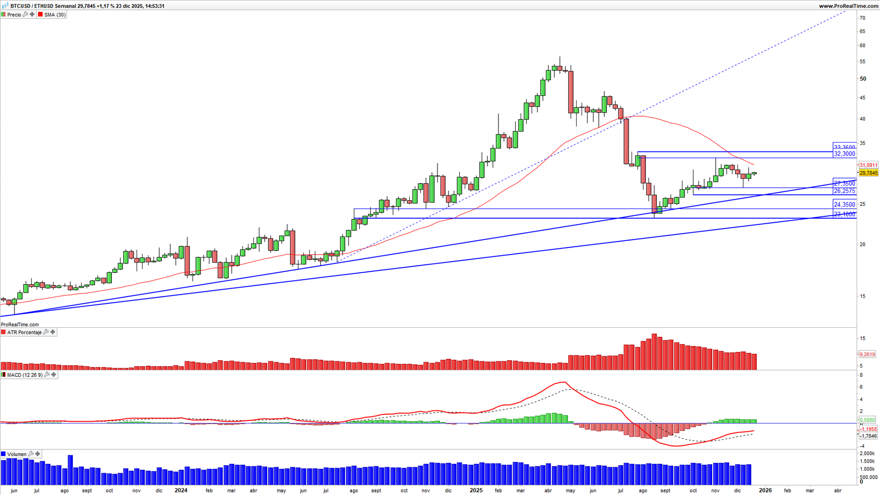 En la comparativa entre el precio de Bitcoin y el precio de Ethereum, observamos que el oscilador MACD ya está registrando ha mejorado tras la activación de cortes ascendentes registrada en las semanas previas, acercándose con ello a la frontera del nivel 0, favoreciendo con ello que Bitcoin pueda registrar un mejor comportamiento que Ethereum de cara a las próximas semanas. Además, tras los apoyos en las directrices alcistas de largo plazo el precio se ha lateralizado entre los 26,25 y los 33,35 puntos, de modo que seguiremos siendo más positivos con Bitcoin que con Ethereum siempre que no asistamos a un precio de cierre semanal por debajo de los 26,25 puntos destacando también el nivel de soporte registrado en las últimas semanas sobre los 27,50 puntos. Otro de los objetivos por parte de los compradores de Bitcoin frente al Ethereum es que el precio consiga registrar próximamente un cierre semanal por encima de la media móvil simple de 30 semanas (línea naranja) la cual se encuentra justo por encima del precio.