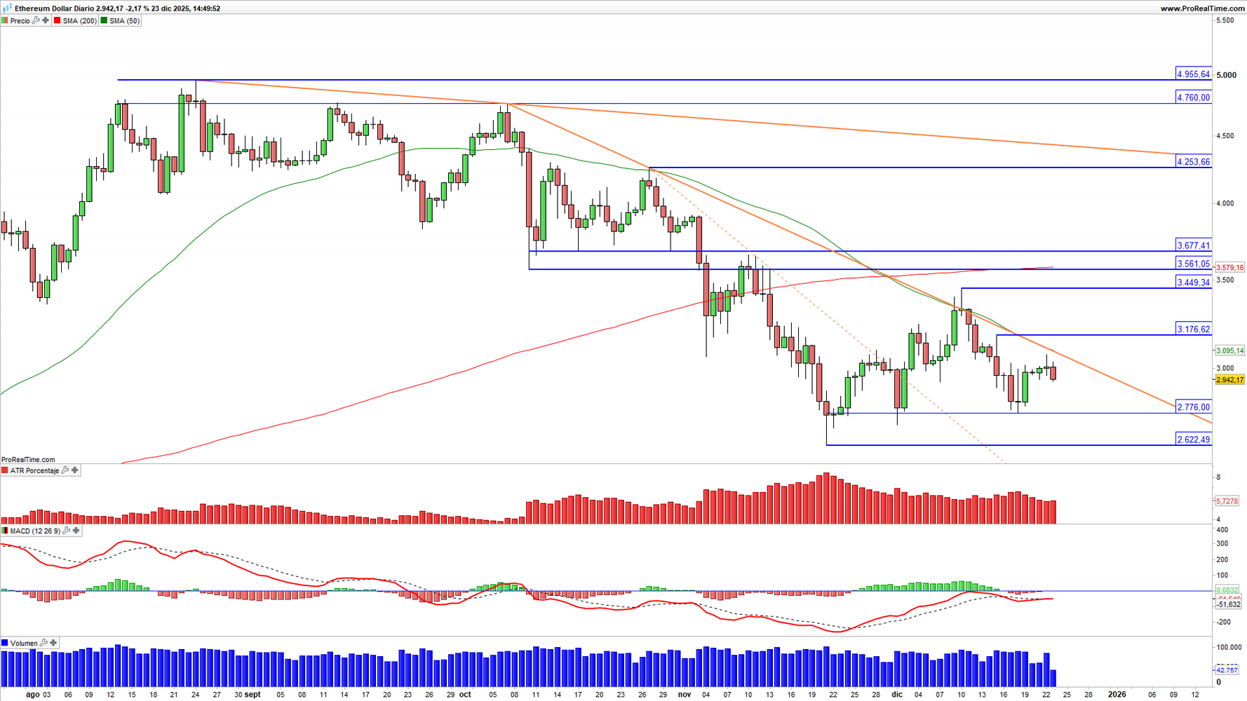 Gráfico 4. Ethereum (ETH) en escala diaria con volatilidad (gráfico central superior), MACD (gráfico central inferior) y actividad de contratación (ventana inferior). Fuente: ProRealTime y elaboración propia.
