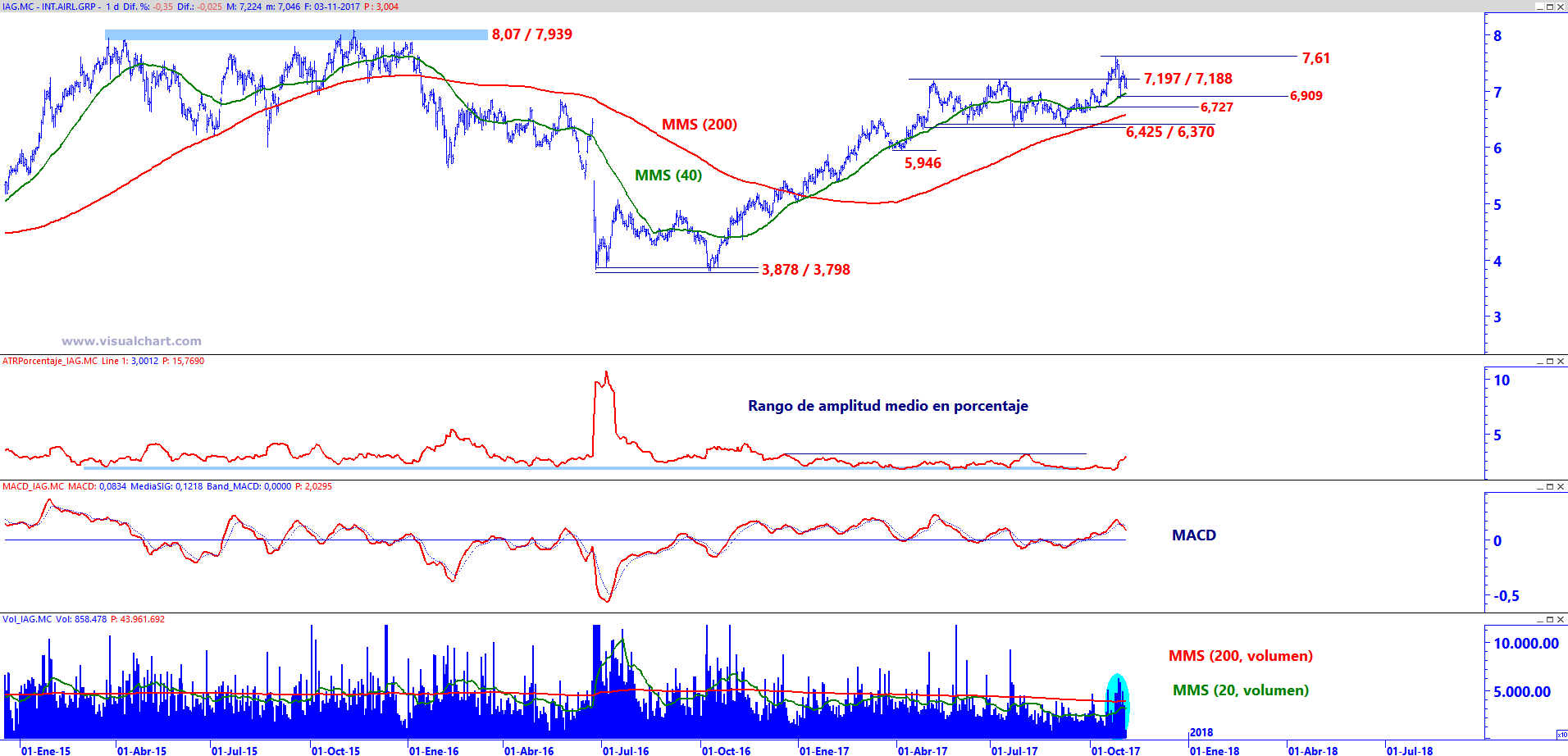 IAG en gráfico diario con Rango de amplitud medio porcentual (ventana central superior) MACD (ventana central inferior) y volumen de negociación (ventana inferior)