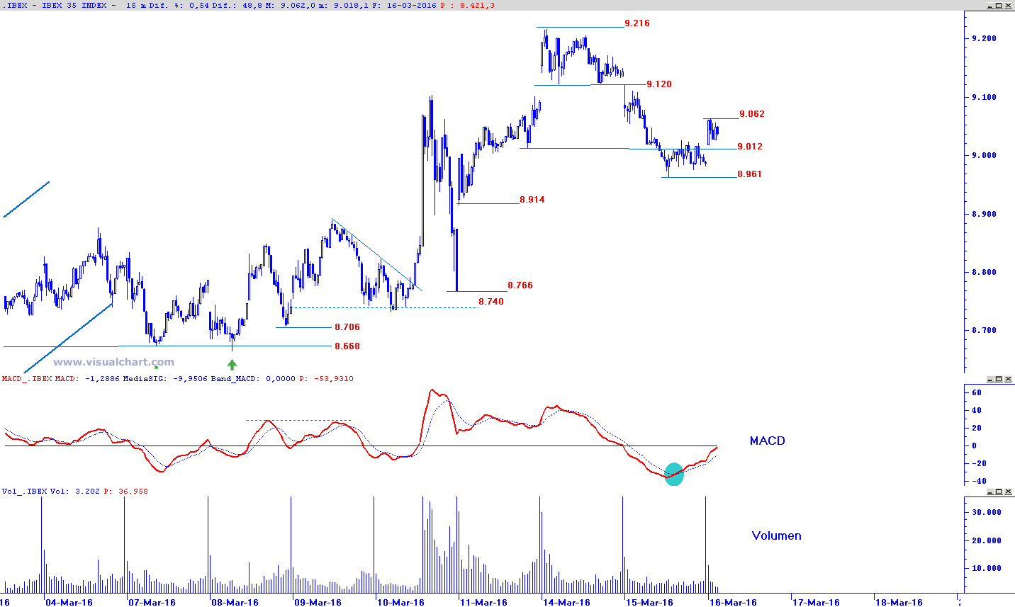 El rebote alcista no consigue, por el momento, que ni el oscilador MACD en escala temporal de 15 minutos resuelva al alza su zona neutral en favor de una continuidad del rebote, sirviendo un potencial cruce al alza de los 9.062 puntos por parte del precio con la señal entrada en terreno positivo del MACD, conjugación de factores que habilitarían un tramo al alza hasta los 9.120 puntos con extensión a cubrir el hueco bajista abierto ayer.