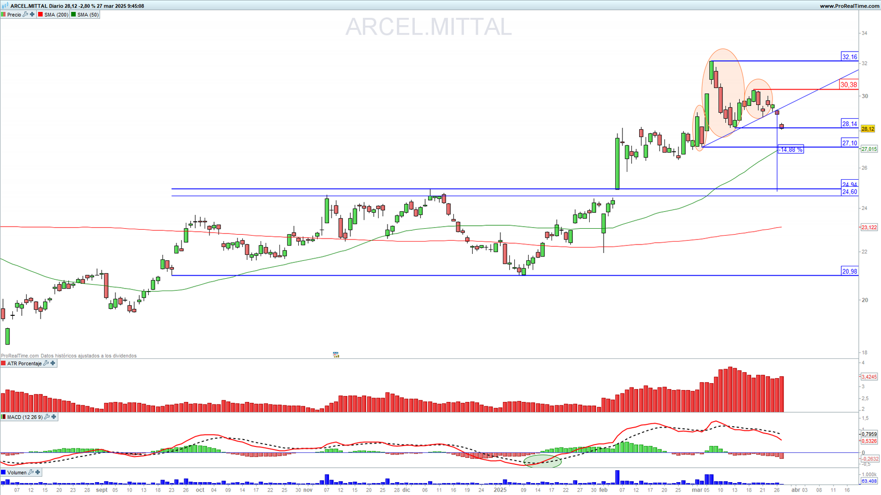 ArcelorMittal (MTS) en escala diaria con volatilidad (ventana central superior), MACD (ventana central inferior) y volumen de contratación (ventana inferior). Fuente: ProRealTime y elaboración propia.