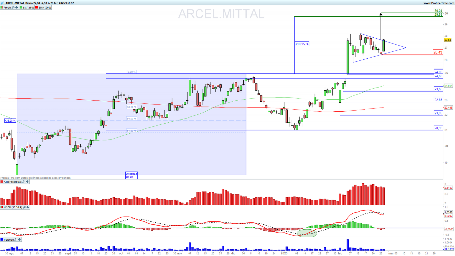ArcelorMittal (MTS) en gráfico diario con Rango de amplitud medio en porcentaje (ventana superior) MACD (ventana central) y volumen de negociación (ventana inferior)