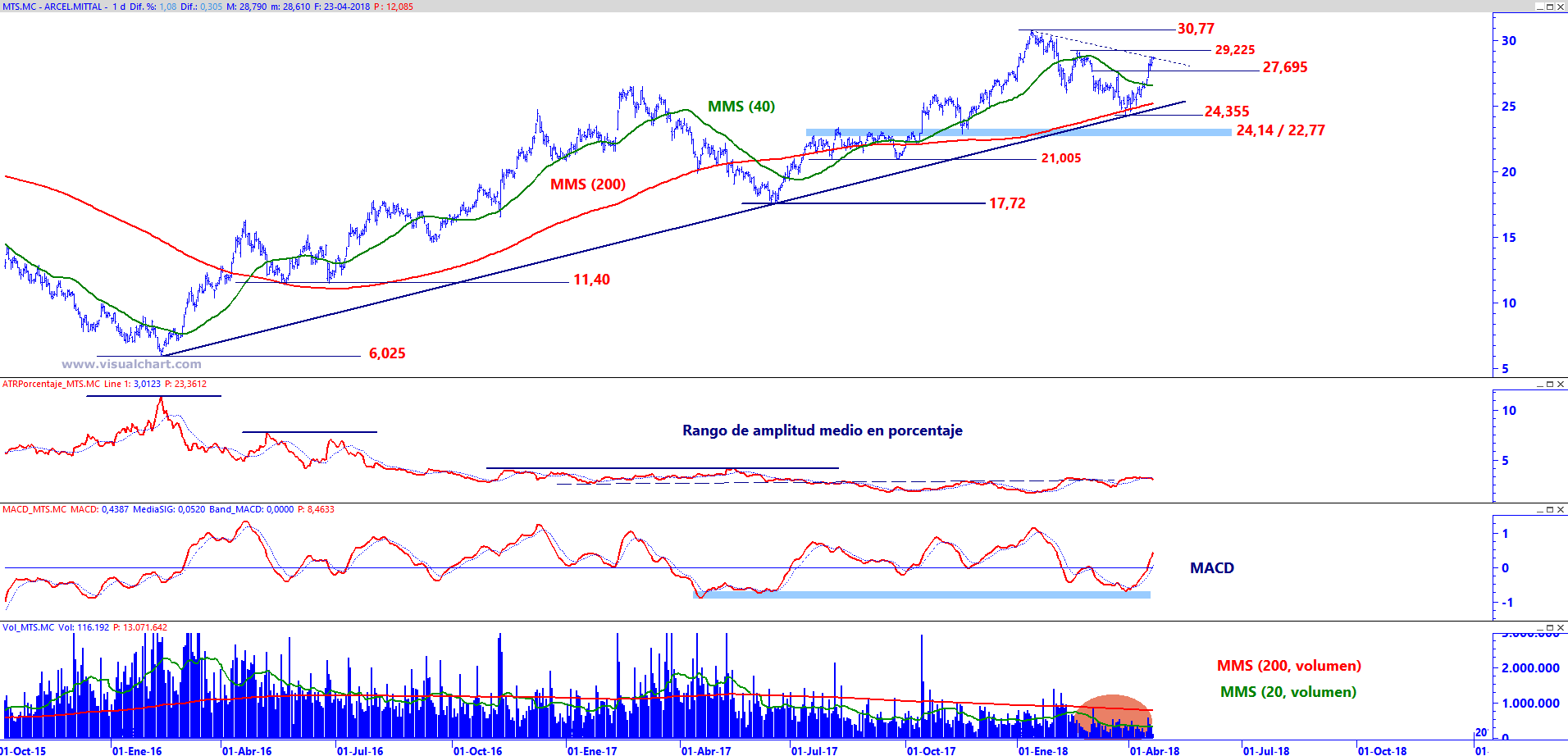 ArcelorMittal en gráfico diario con Rango de amplitud medio en porcentaje (ventana central superior), MACD (ventana central inferior) y volumen de contratación (ventana inferior)