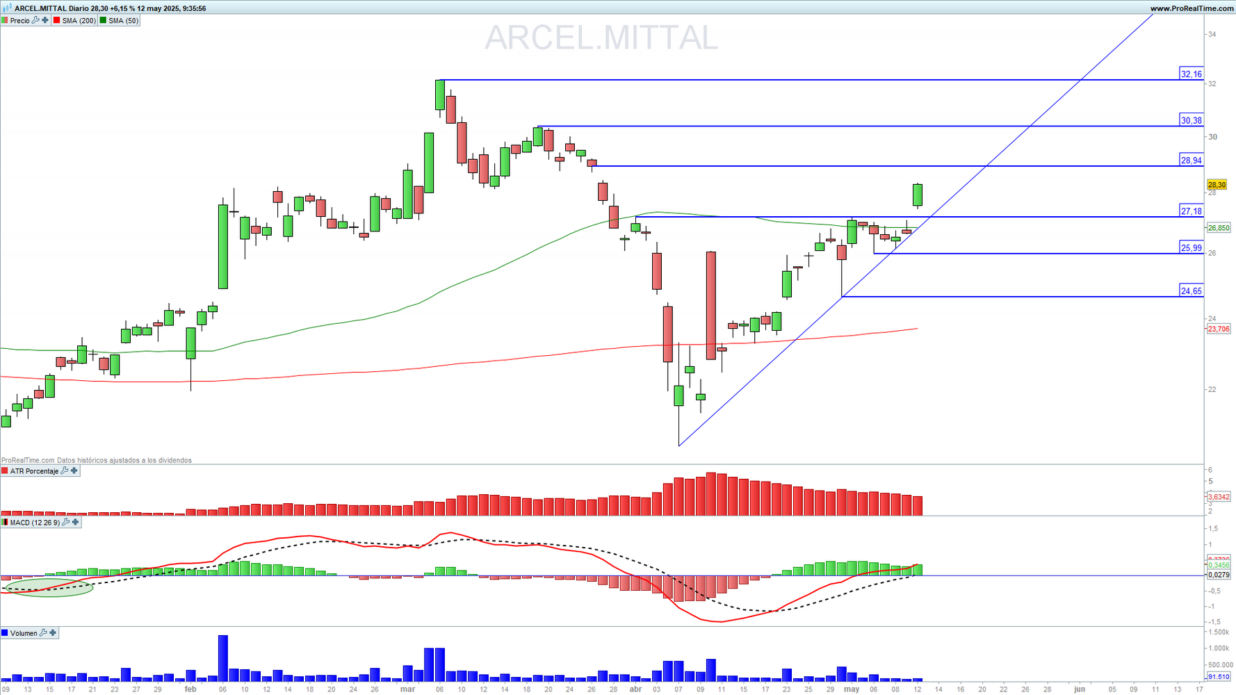 ArcelorMittal (MTS) en gráfico diario con Rango de amplitud medio en porcentaje (ventana superior) MACD (ventana central) y volumen de negociación (ventana inferior)