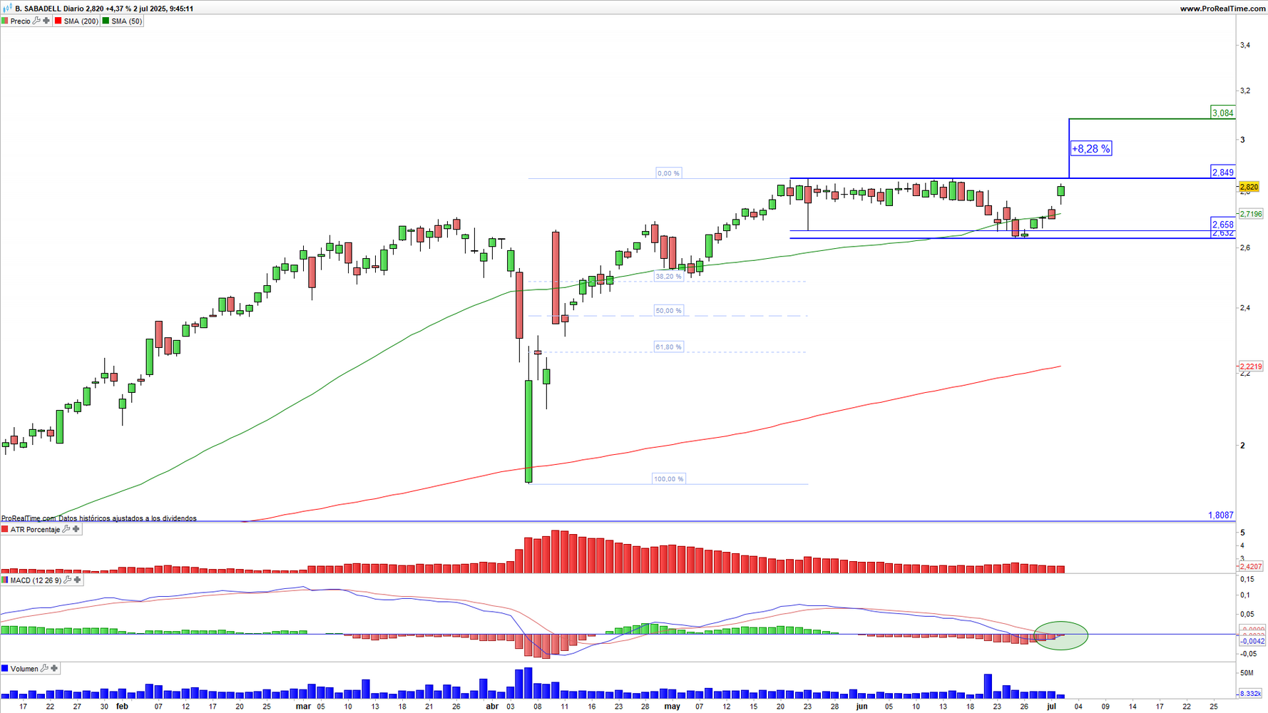 Banco Sabadell (SAB) en escala diaria con volatilidad (gráfico central superior), MACD (gráfico central inferior) y actividad de contratación (ventana inferior). Fuente: ProRealTime y elaboración propia.