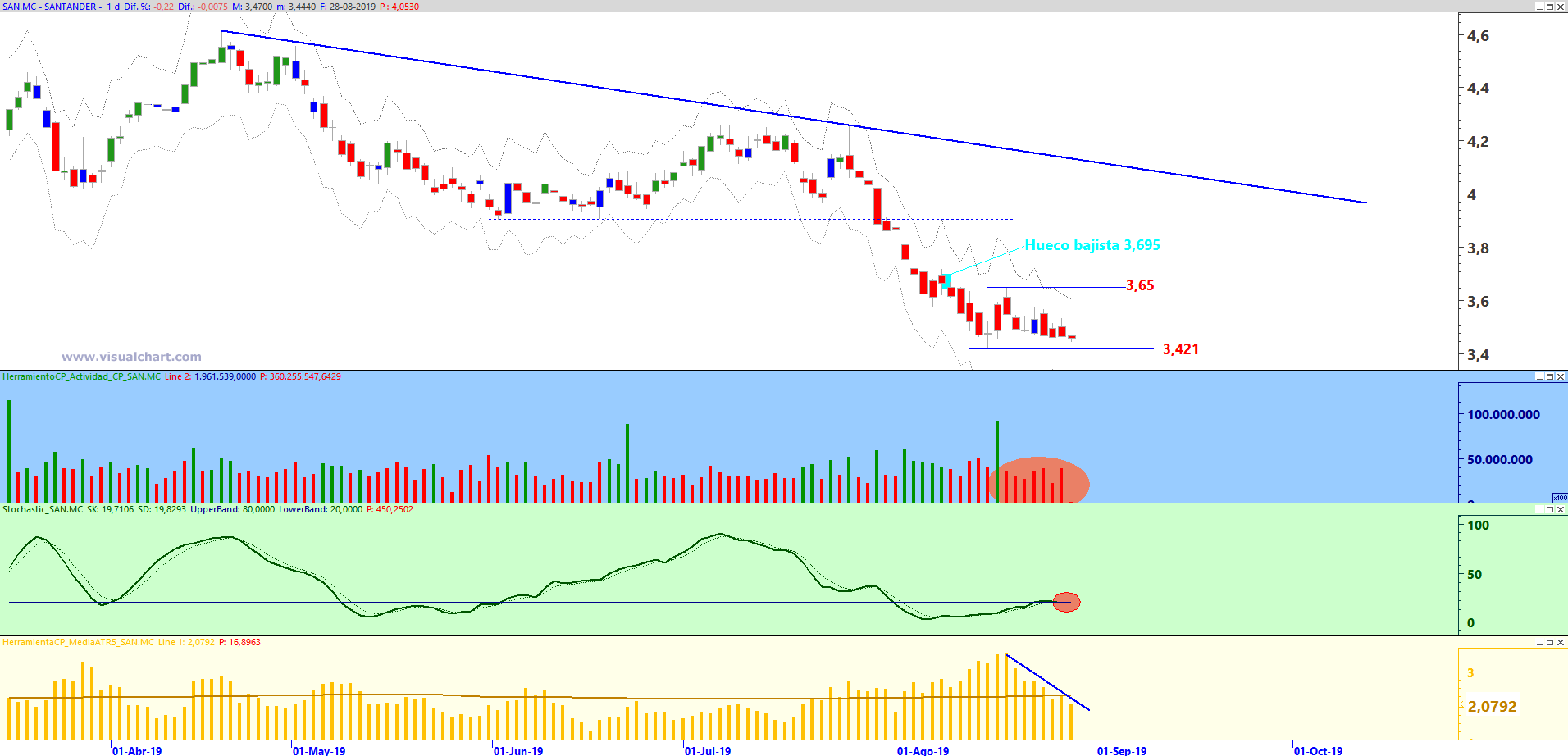 Banco Santander en gráfico diario con Rango de amplitud medio en porcentaje (ventana central superior), MACD (ventana central inferior) y volumen de contratación (ventana inferior)