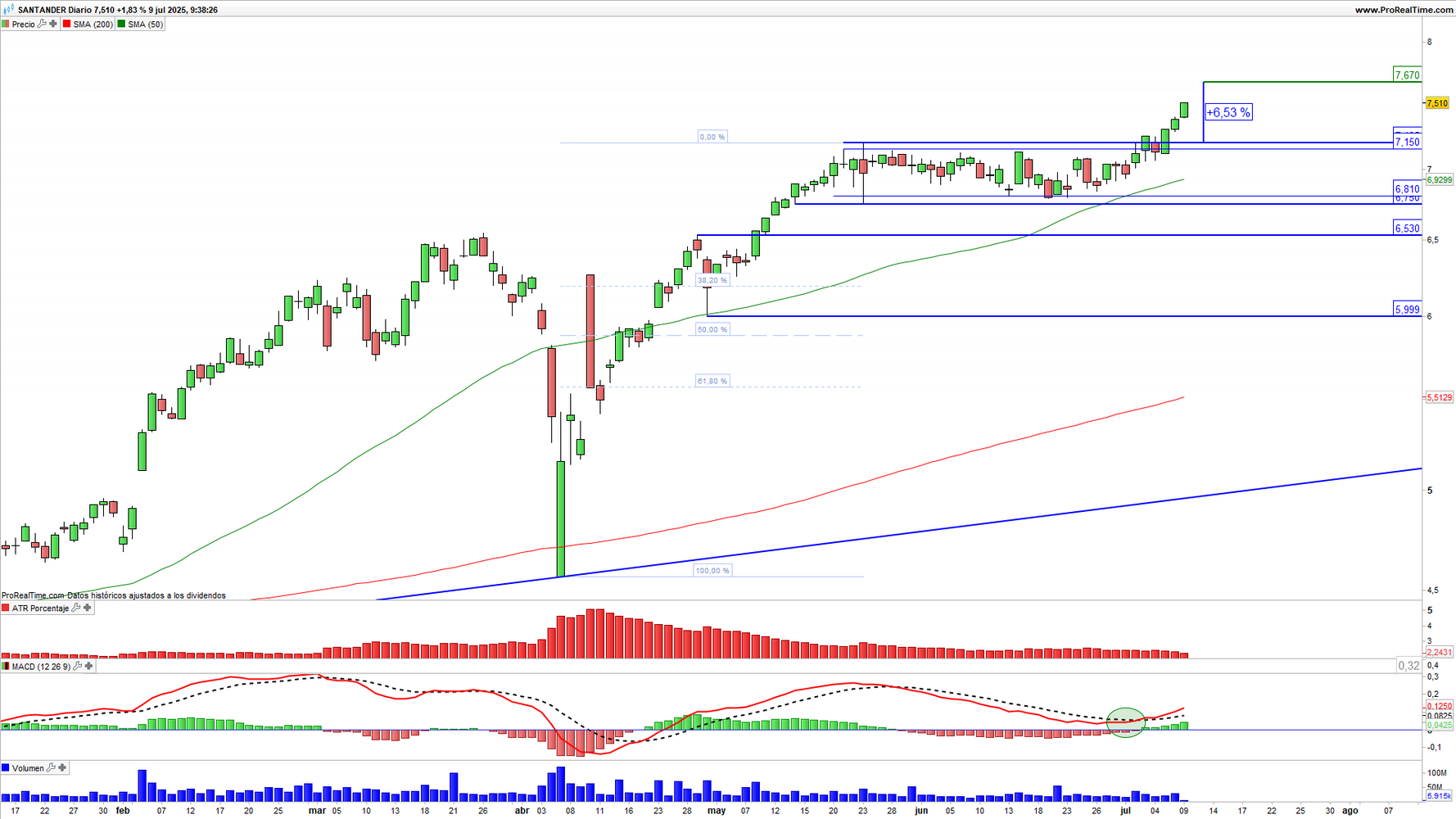 Banco Santander (SAN) en escala diaria con volatilidad (gráfico central superior), MACD (gráfico central inferior) y actividad de contratación (ventana inferior). Fuente: ProRealTime y elaboración propia.
