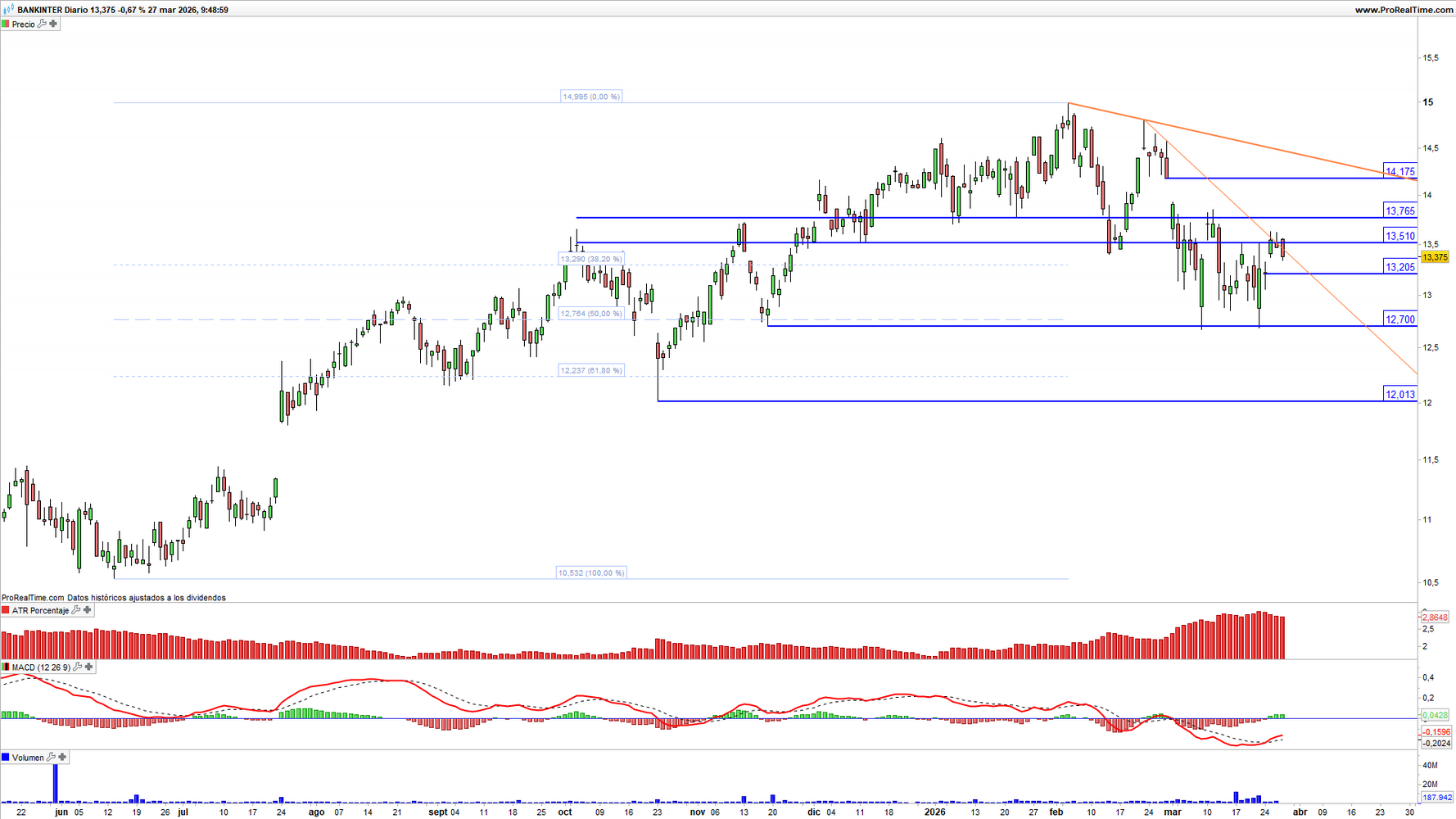 Bankinter (BKT) en escala diaria con volatilidad (gráfico central superior), MACD (gráfico central inferior) y actividad de contratación (ventana inferior). Fuente: ProRealTime y elaboración propia.