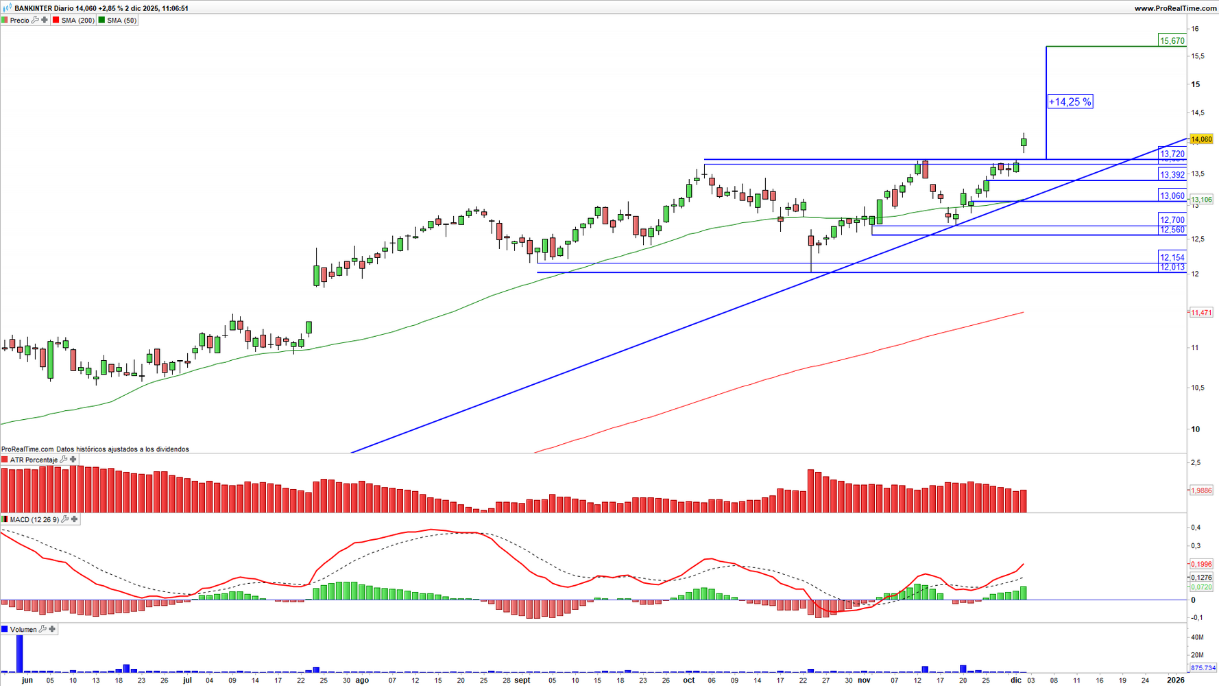 Bankinter (BKT) en escala diaria con volatilidad (gráfico central superior), MACD (gráfico central inferior) y actividad de contratación (ventana inferior). Fuente: ProRealTime y elaboración propia.