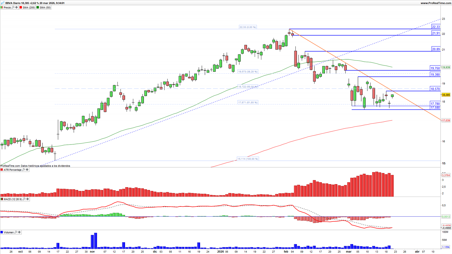BBVA (BBVA) en escala diaria con volatilidad (gráfico central superior), MACD (gráfico central inferior) y actividad de contratación (ventana inferior). Fuente: ProRealTime y elaboración propia.