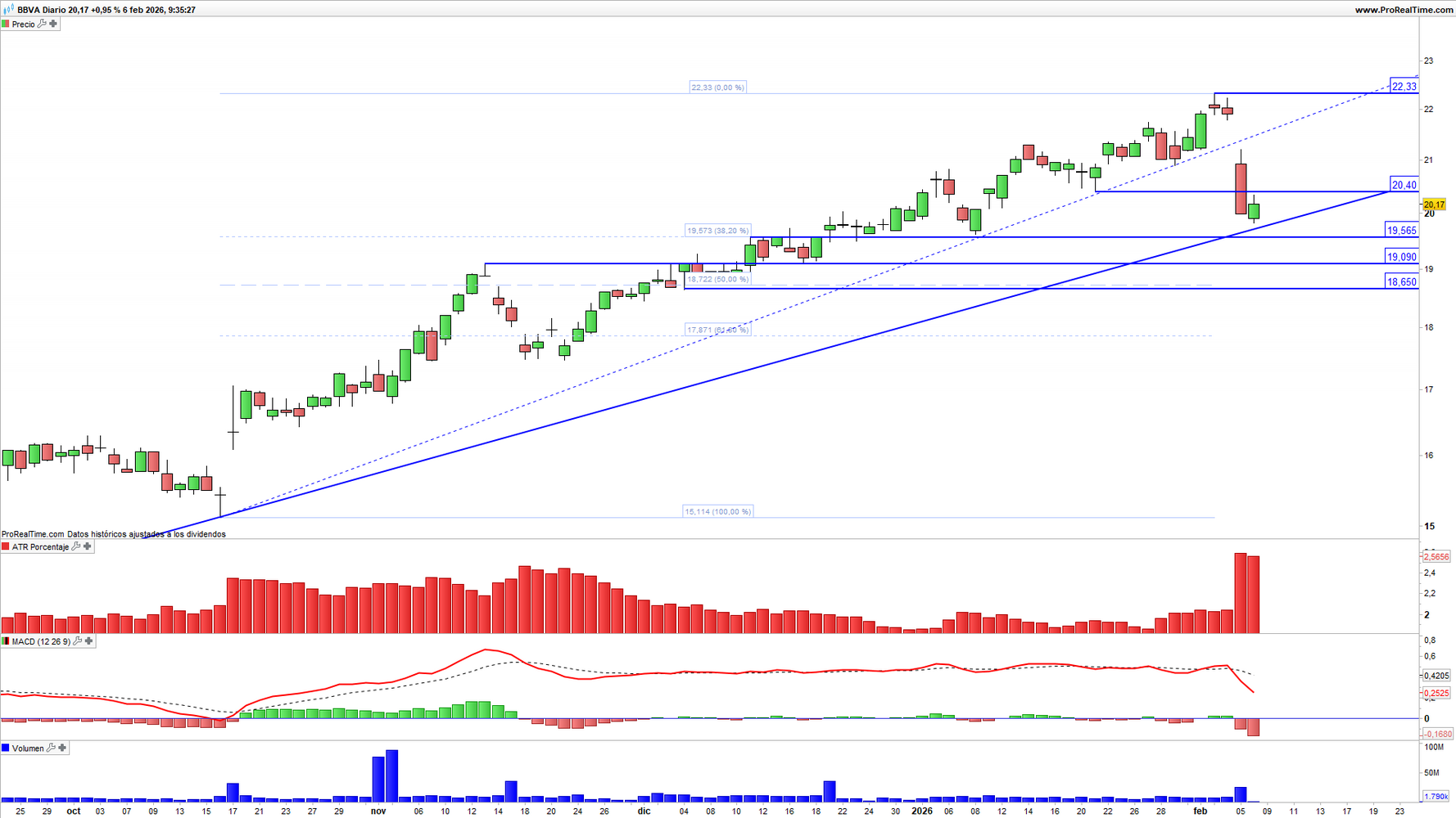 BBVA (BBVA) en escala diaria con volatilidad (gráfico central superior), MACD (gráfico central inferior) y actividad de contratación (ventana inferior). Fuente: ProRealTime y elaboración propia.