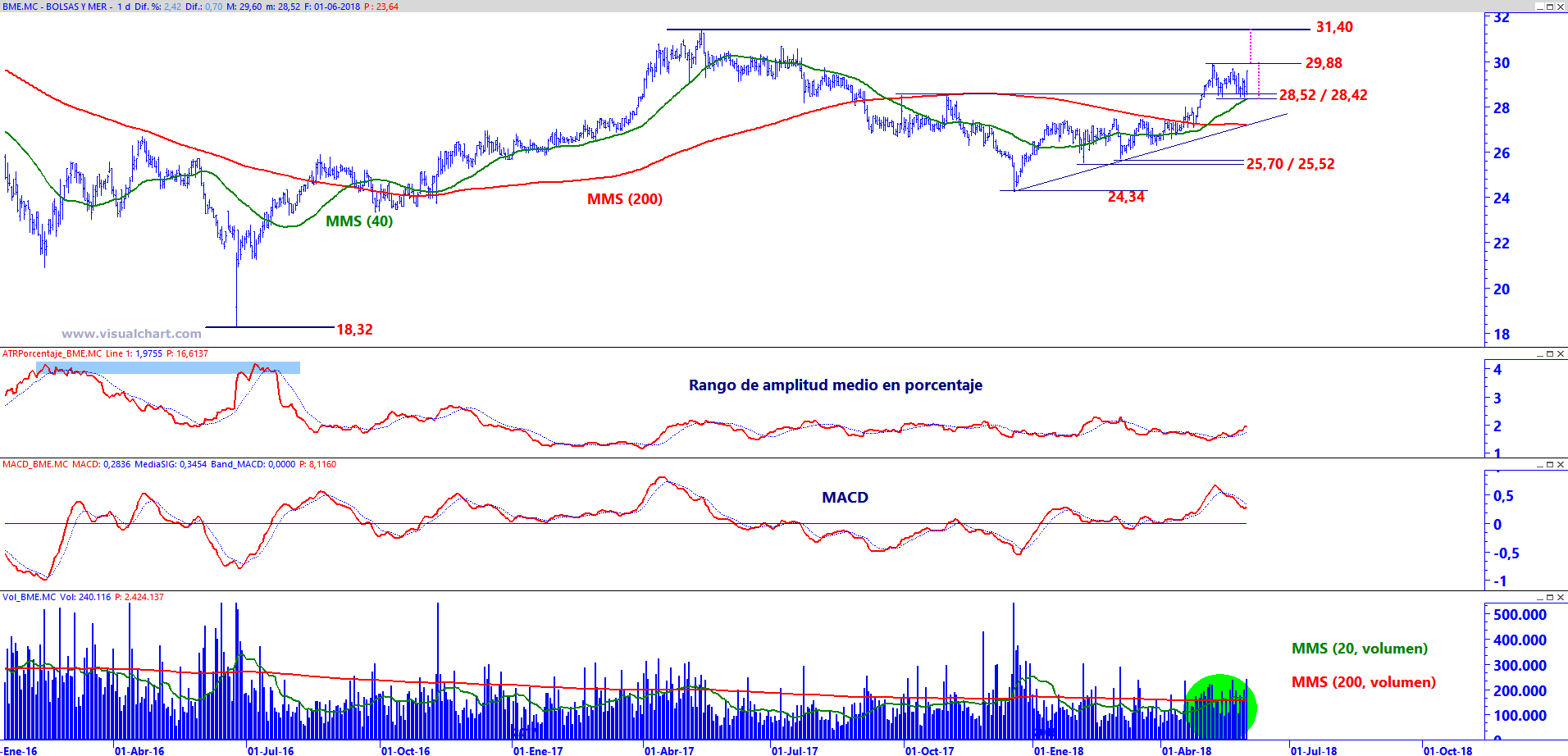 BME en gráfico diario con Rango de amplitud medio en porcentaje (ventana central superior), MACD (ventana central inferior) y volumen de contratación (ventana inferior)