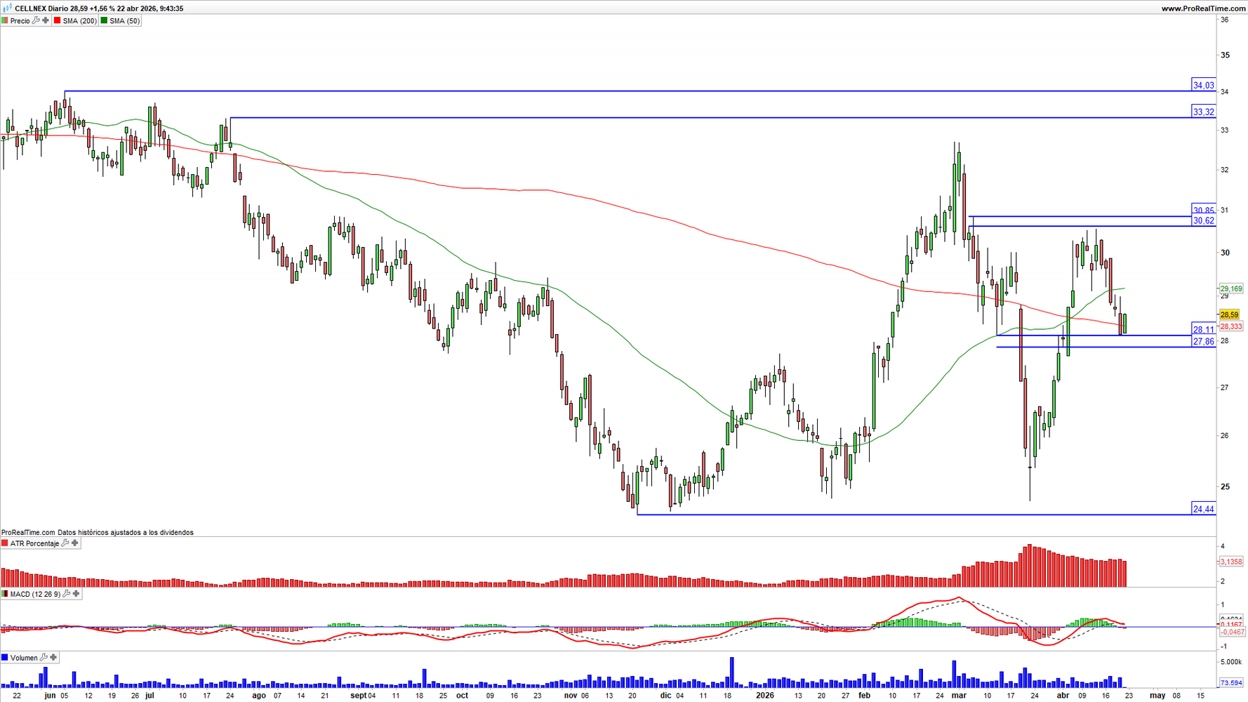 Cellnex (CLNX) en escala diaria con volatilidad (gráfico central superior), MACD (gráfico central inferior) y actividad de contratación (ventana inferior). Fuente: ProRealTime y elaboración propia.