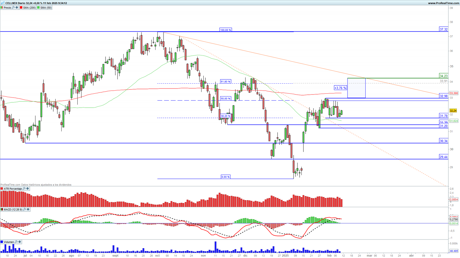 Cellnex (CLNX) en escala diaria con volatilidad (gráfico central superior), MACD (gráfico central inferior) y actividad de contratación (ventana inferior). Fuente: ProRealTime y elaboración propia.