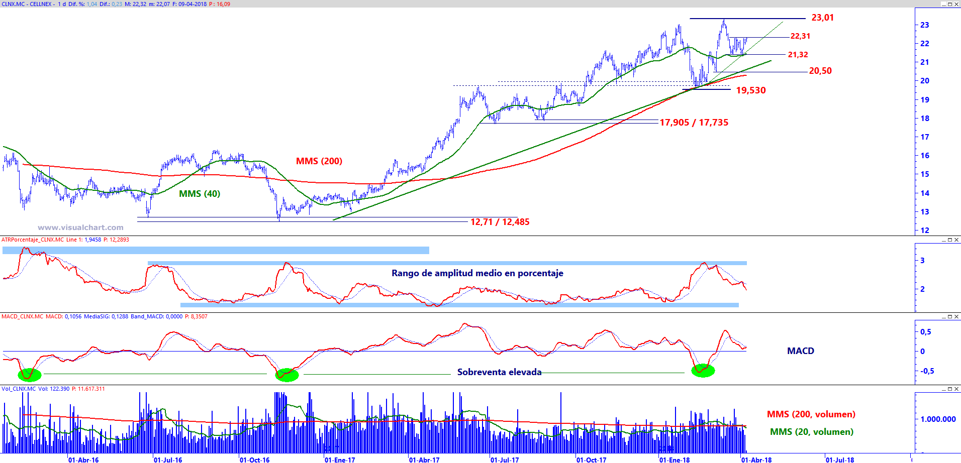 Cellnexdesarrolla un movimiento de consolidación en el corto plazo que identificamos entre el techo de los 22,31 y el suelo de los 21,32, soporte que funciona como aproximación a su media móvil simple de 40 periodos (ver MMS40). Dicho movimiento permite la normalización de lecturas en indicadores / osciladores tras un periodo de elevada volatilidad y un exceso de ánimo comprador acontecido desde el mínimo significativo de los 19,53. En estos momentos, la curva de precios se encuentra atacando la parte alta del canal lateral analizado, cuya superación habilitaría a las compras a actualizar objetivos al alza rumbo a los actuales máximos anuales de los 23,01.
